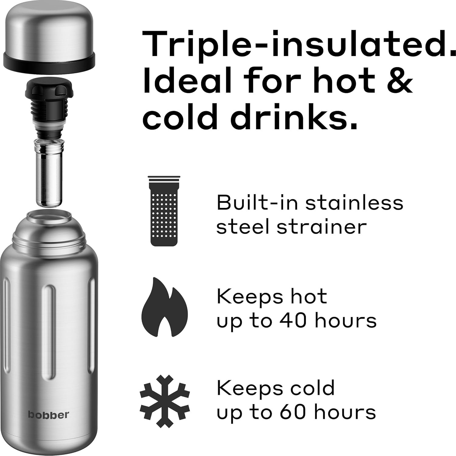 BOBBER 34 oz Vacuum Insulated Stainless Steel Water Bottle with Removable Tea Infuser – Dishwasher Safe, Keeps Drinks Hot for 40 Hours – Triple Walled Coffee Thermo for Hot Drinks (Matte)