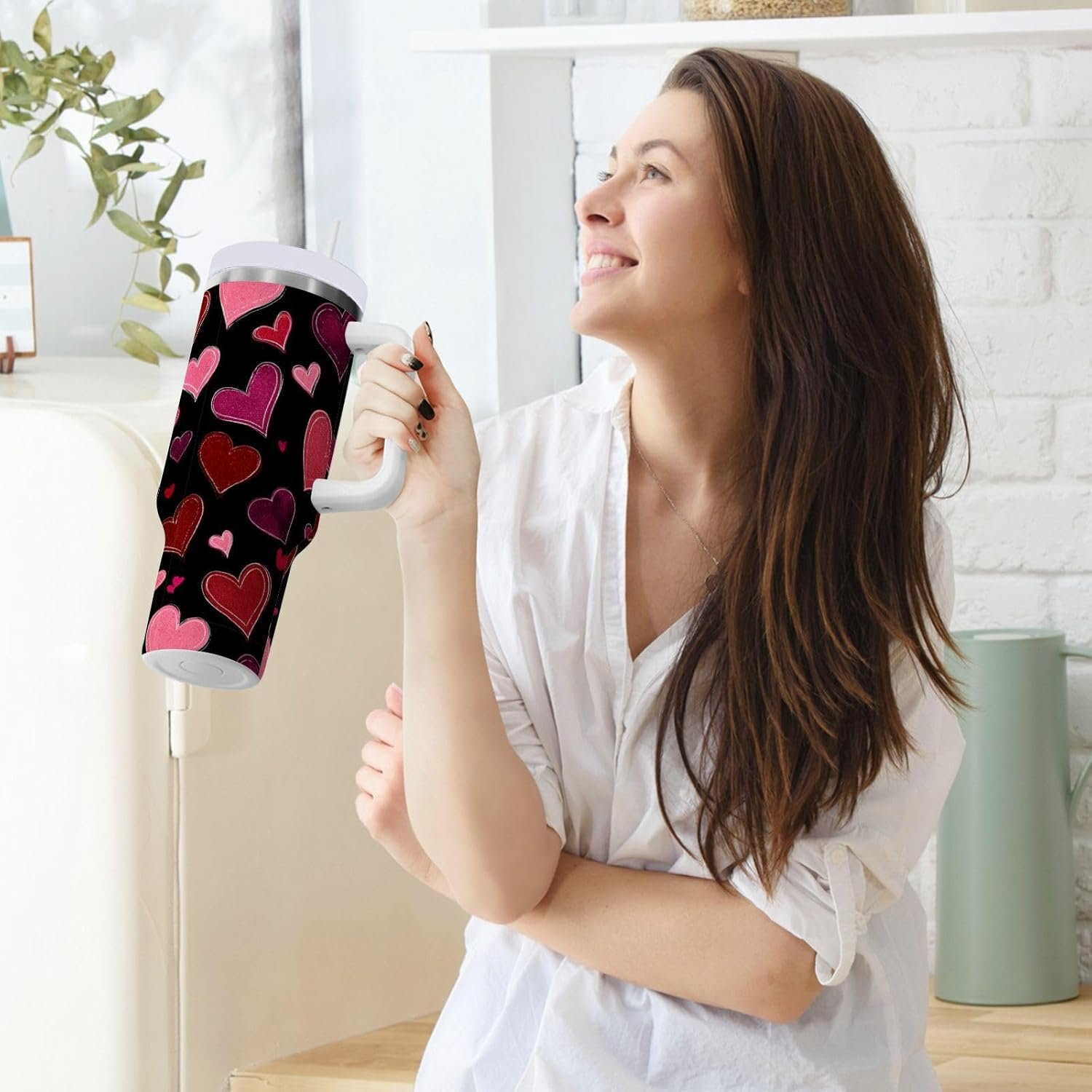 Boccsty Valentine’s Day Pink Hearts Insulated Tumblers Reusable Stainless Steel Tumbler 40 oz Cup Coffee Travel Mug Water Bottle with Handle & Flip Straw for Home Office Car