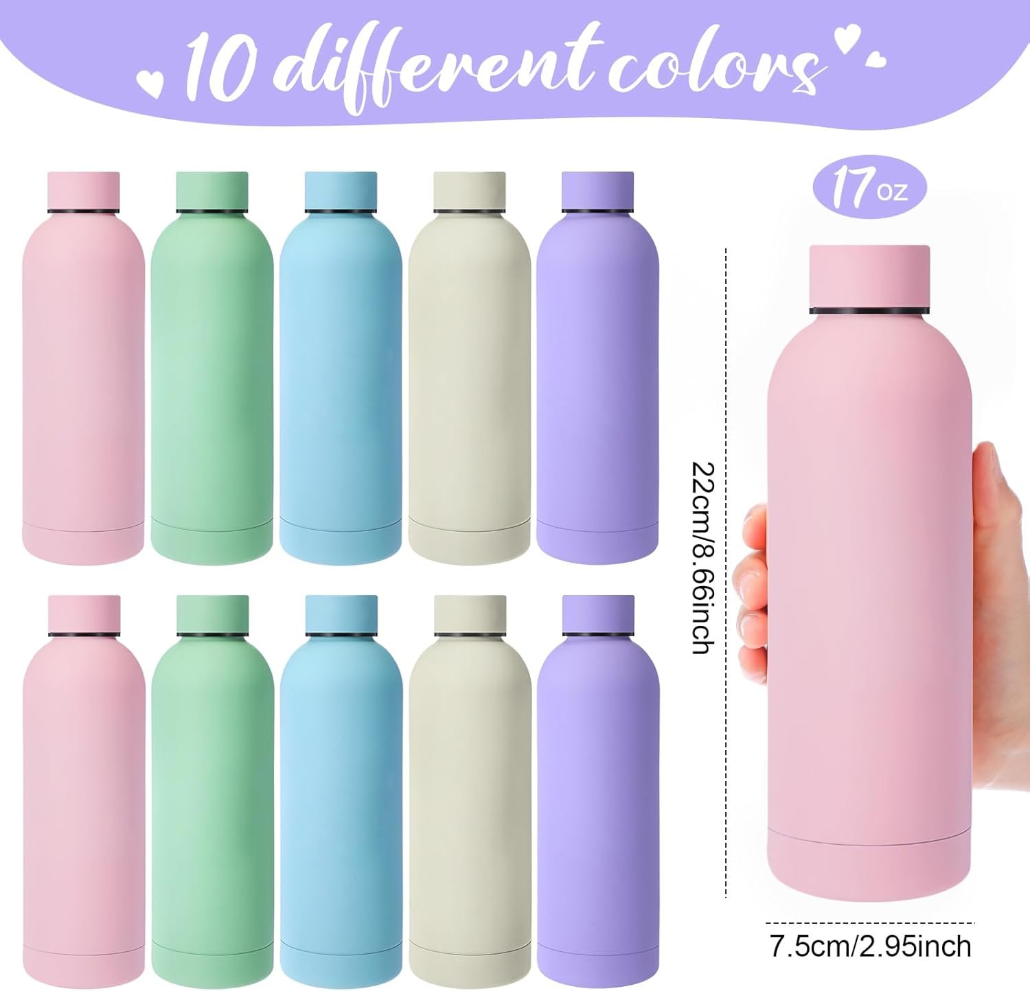 Thanksgiving Christmas Colorful Water Bottles for Laser Engraving: this set includes 10 vibrant and elegant stainless steel water bottles, each with a 17 oz ( 500ml) capacity, measuring 8.66 inches in height and 2.95 inches in width; Whether you’re enjoying a refreshing cold beverage or a steaming hot drink, this bottle ensures your drinks stay at the perfect temperature throughout the day