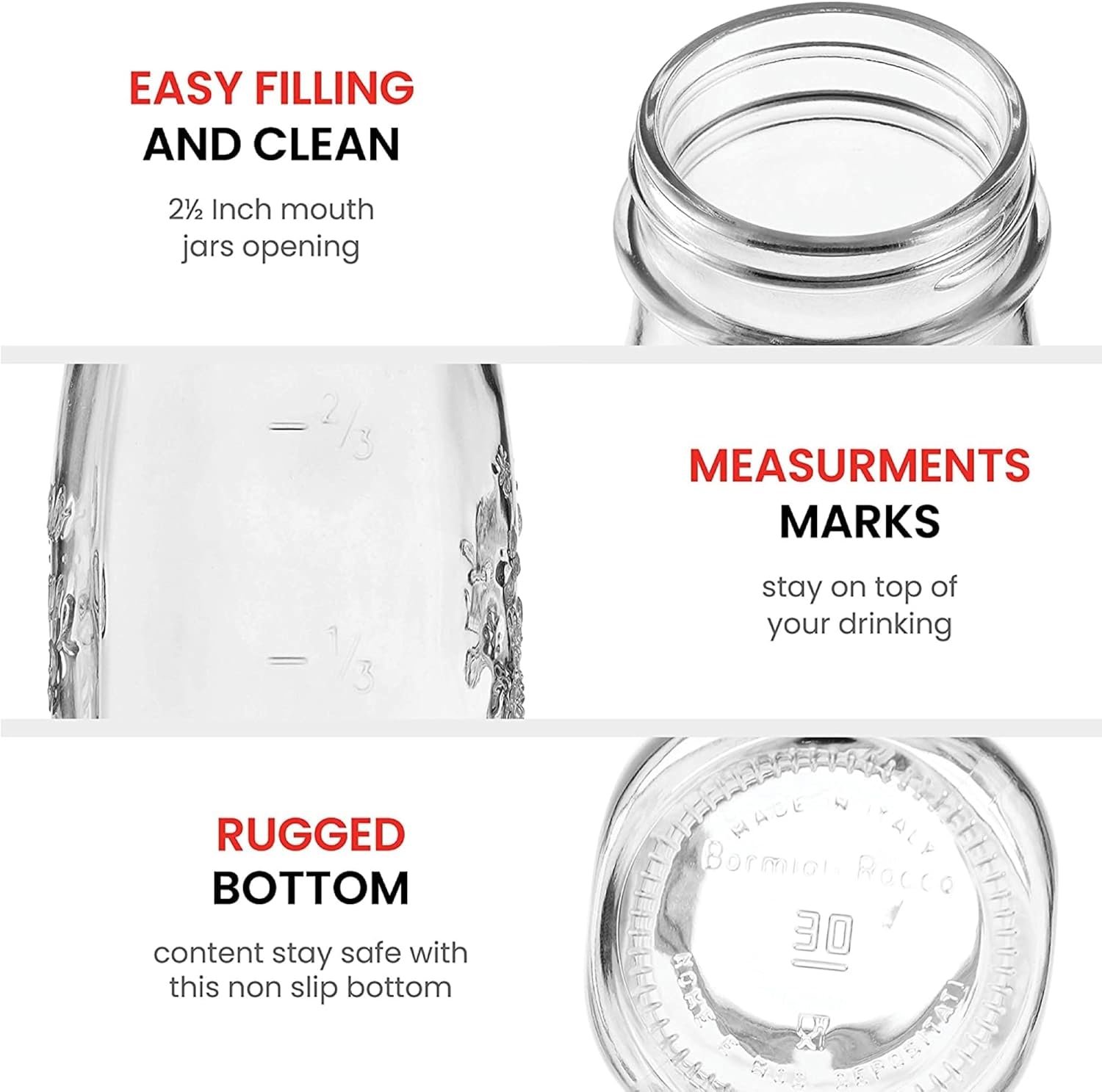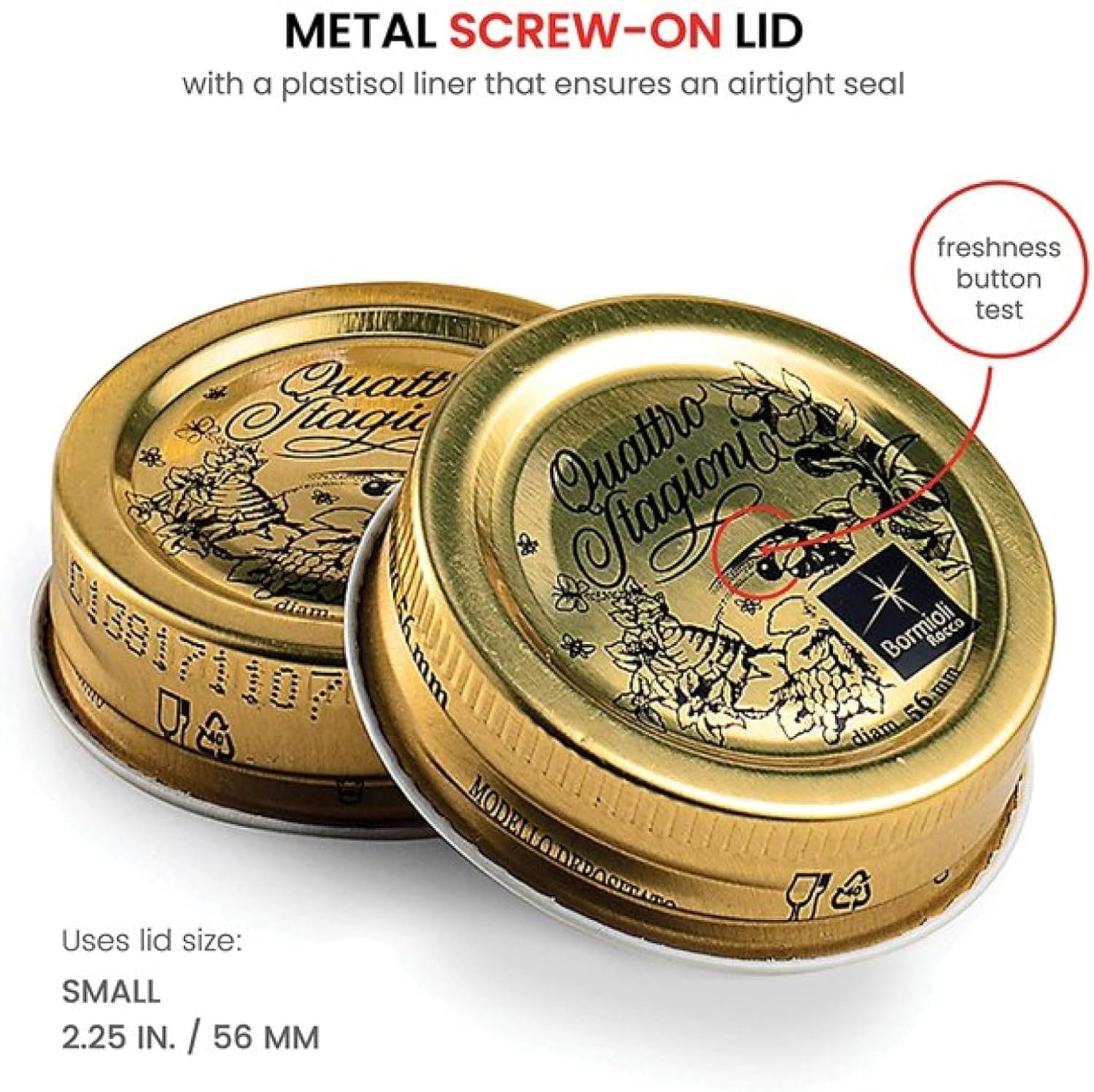 Bormioli Rocco Quattro Stagioni Small Bottles (Set of 6) – 6.75 Oz. Embossed Reusable Glass Jars with Airtight Lid, For Food Prep, Sauces, Gifts & Crafts – Round Bottle Containers, Made in Italy
