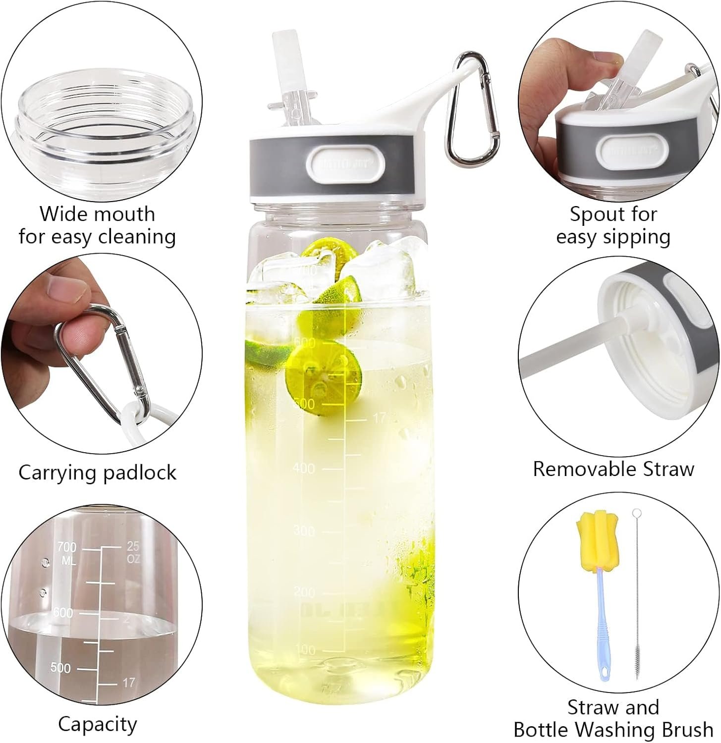 32 oz Water Bottle Material: Tritan, 100% healthy material. Straw Lid:Great for using and humanization. Easy Wash: Convenient for cleaning Leak Proof: Prevent to leak,you can take it in bag. Time Marker: Help track water intake.