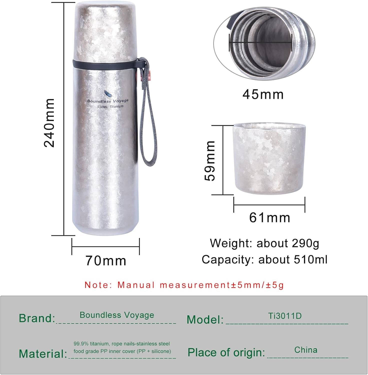 MATERIAL – 99.8% titanium. Made of high quality titanium, never rust, anti-corrosion, good heat, high hardness, no deformation, and solid structure. High-quality base material, heat preservation and cold preservation, high temperature resistance, and prolong the service life of the bottle.