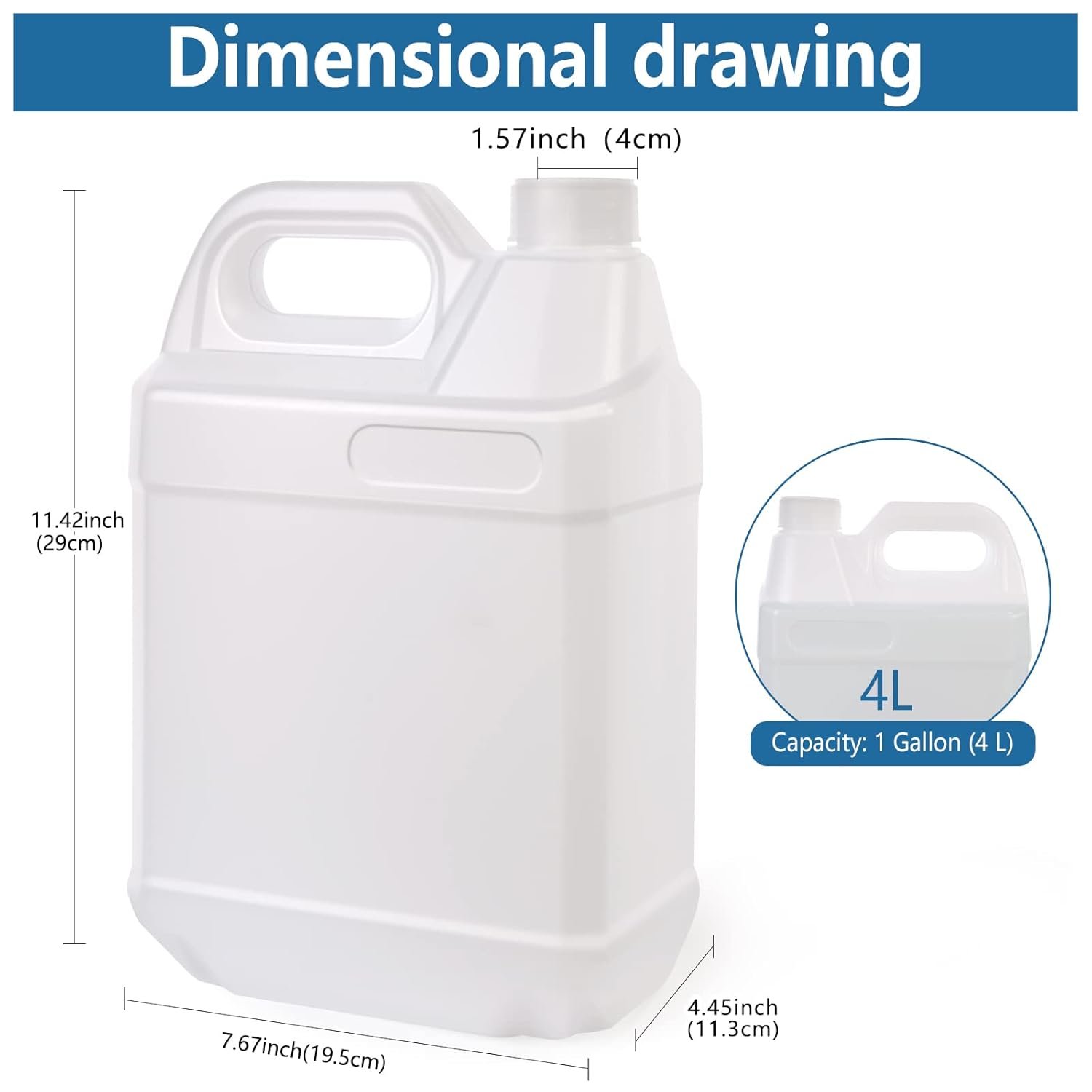2 Pack 1 Gallon Clear Plastic Jugs with Lids Size: Length: 7.67 inch(19.5 cm), Width: 4.45 inch(11.3 cm), Height: 11.42 inch(29 cm); Capacity: 1 Gallon(4 L)
