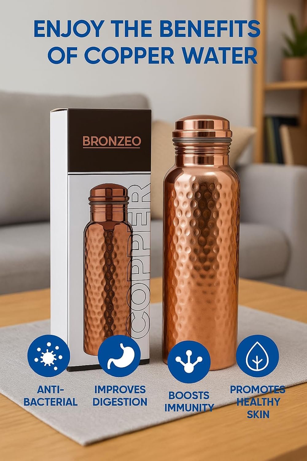 Elevate your wellness journey with the 100% Pure Copper Water Bottle – Hammered Design. Ideal for those who care about both their health and the environment. Stay hydrated, stay healthy, and make a positive impact on the planet.