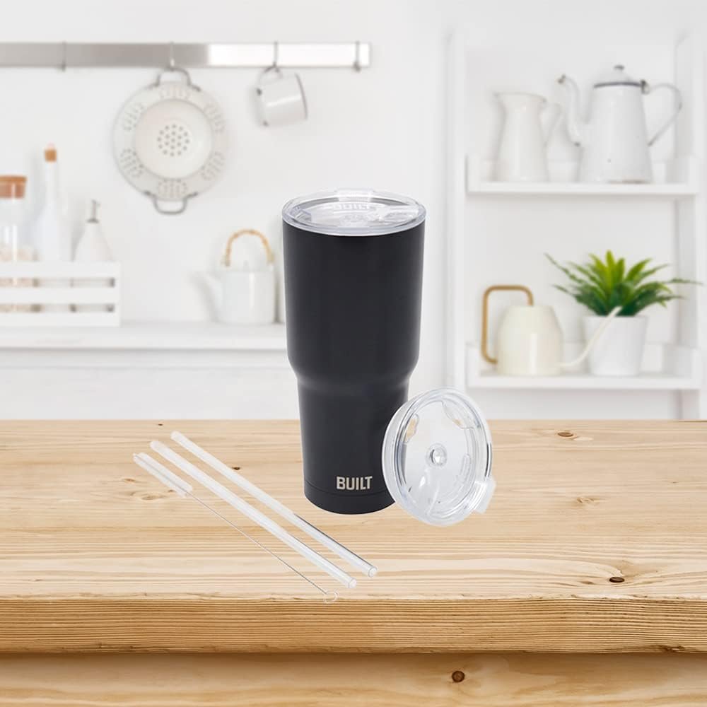 BUILT Double Walled Stainless Steel Tumbler Set with Replacement Lid, 2 Reusable Tritan Wire Straw Cleaning Brush in Gift Box, 1 Count (Pack of 1), Black, 30 fl.oz.