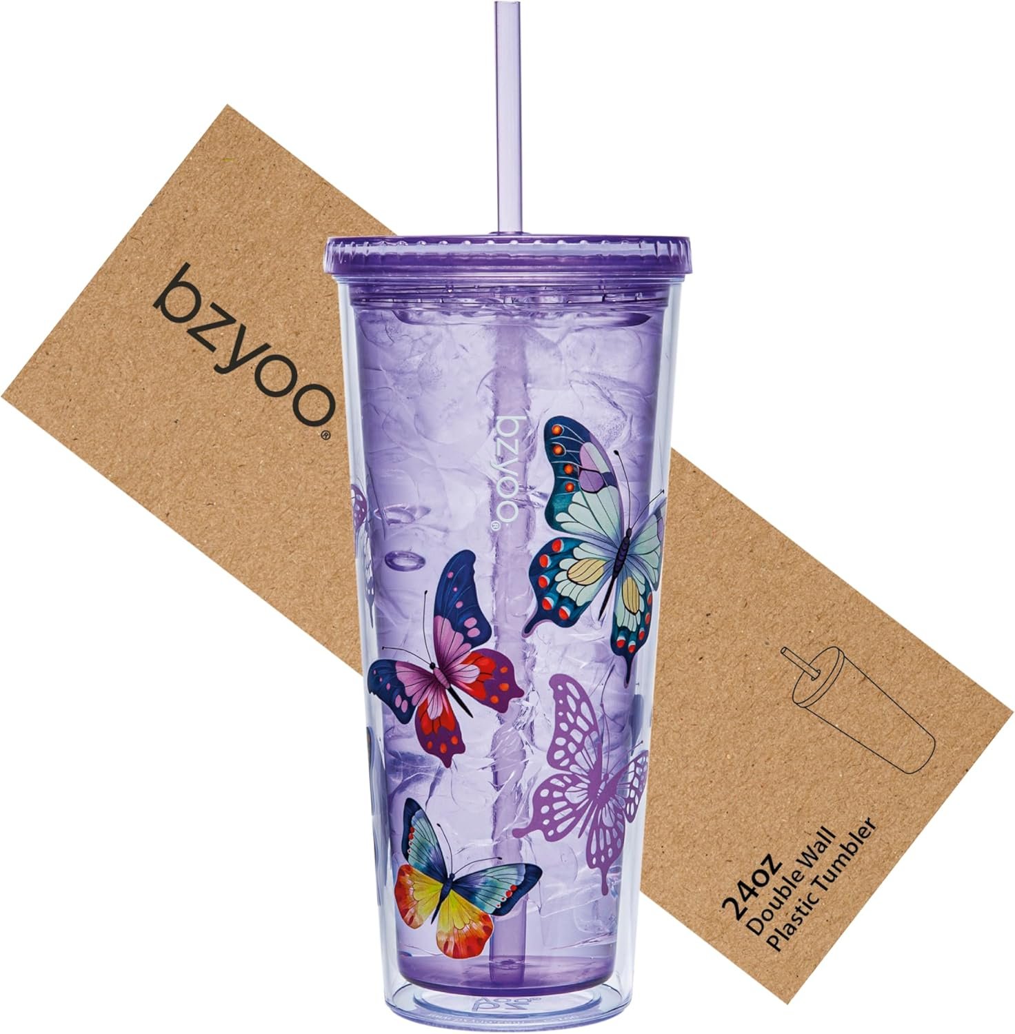 bzyoo SIP 24oz (710ml) Double Wall Plastic Tumbler with Lid and Straw Cold Drink Travel Mug Reusable Party Cup Perfect for Ice Coffee, Tea Office Poolside Parties Gifts Color: Butterfly Purple