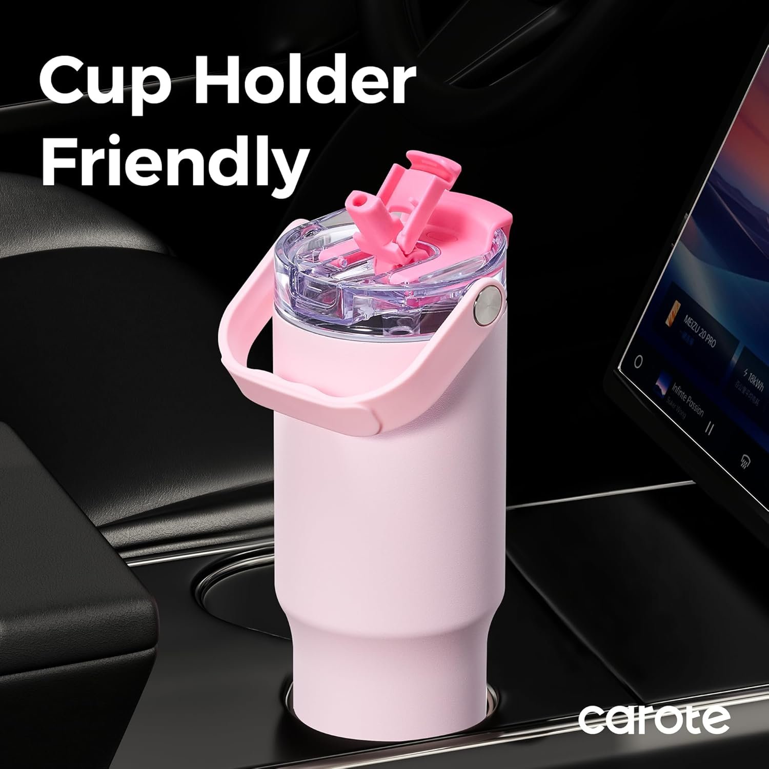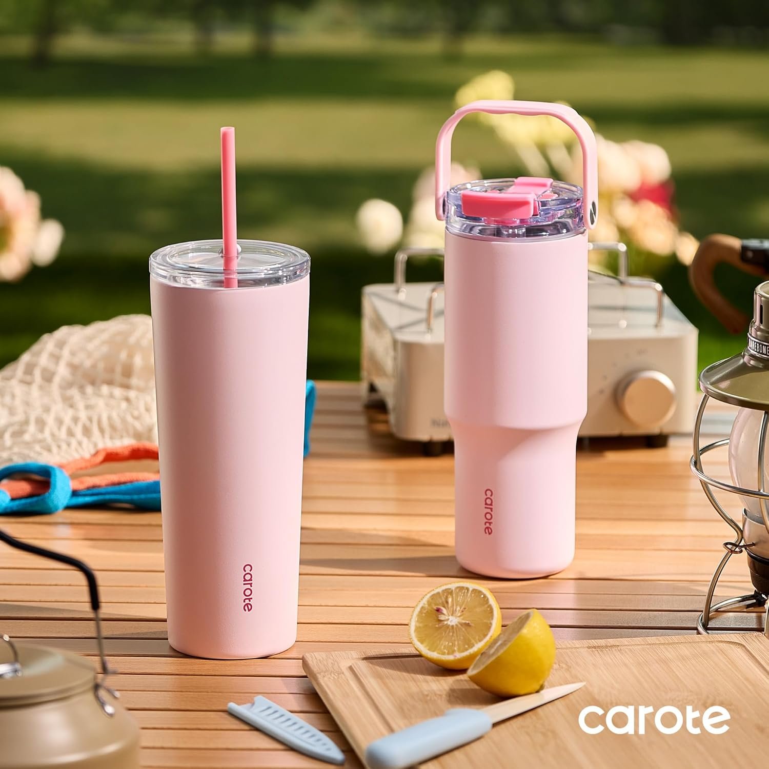 CAROTE 30 oz Insulated Water Bottle with Handle & 32 oz Travel Tumblers with Straw, Leakproof Dual Drink Ports Lid, Double-Wall Stainless Steel Vacuum Insulated for Sports, School (Pink)