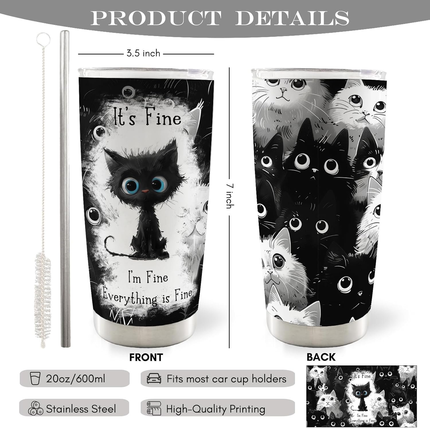 Cat Gifts for Cat Lovers, Funny Black Cats 20oz Travel Coffee Mug Tumbler, Im Fine Everythings Fine Stainless Steel Tumbler with Lid and Straw
