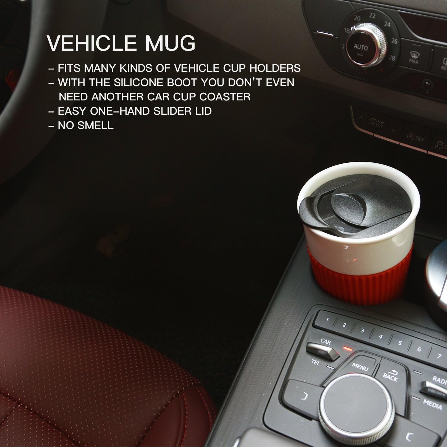 At the bottom of the mug is a silicone boot. These is no sound when you put down the cup. It also can be as a coaster to protect your table or vehicle cup holders and won’t slip to damage your countertop. You don’t even need to buy another coaster!