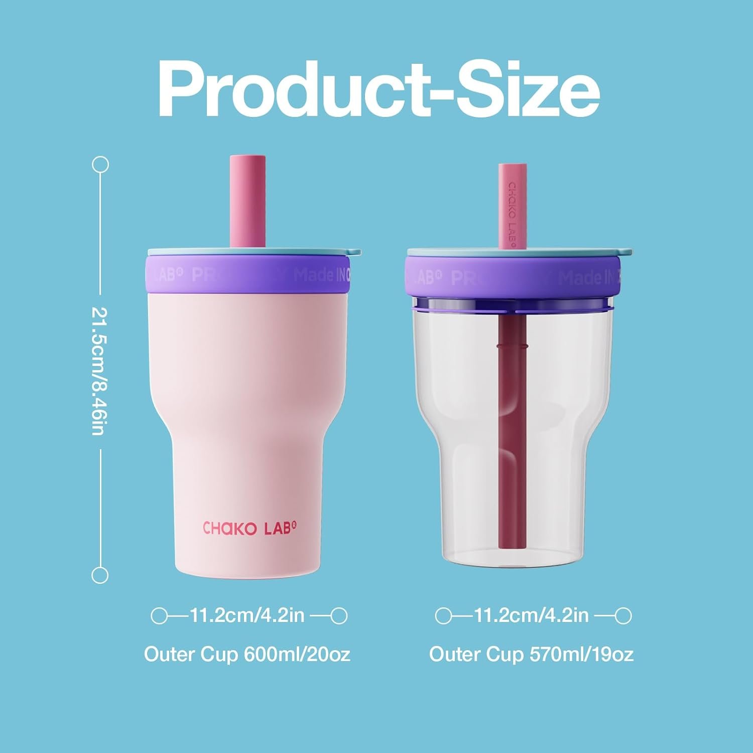 CHAKO LAB Insulated Stainless Steel Water Bottle | Dual-layer tumbler with Glass Linner and Stainsteel Linner | BPA-Free Leak Proof Thermos | 20oz Bottle with Two Straw | Pink & Purple