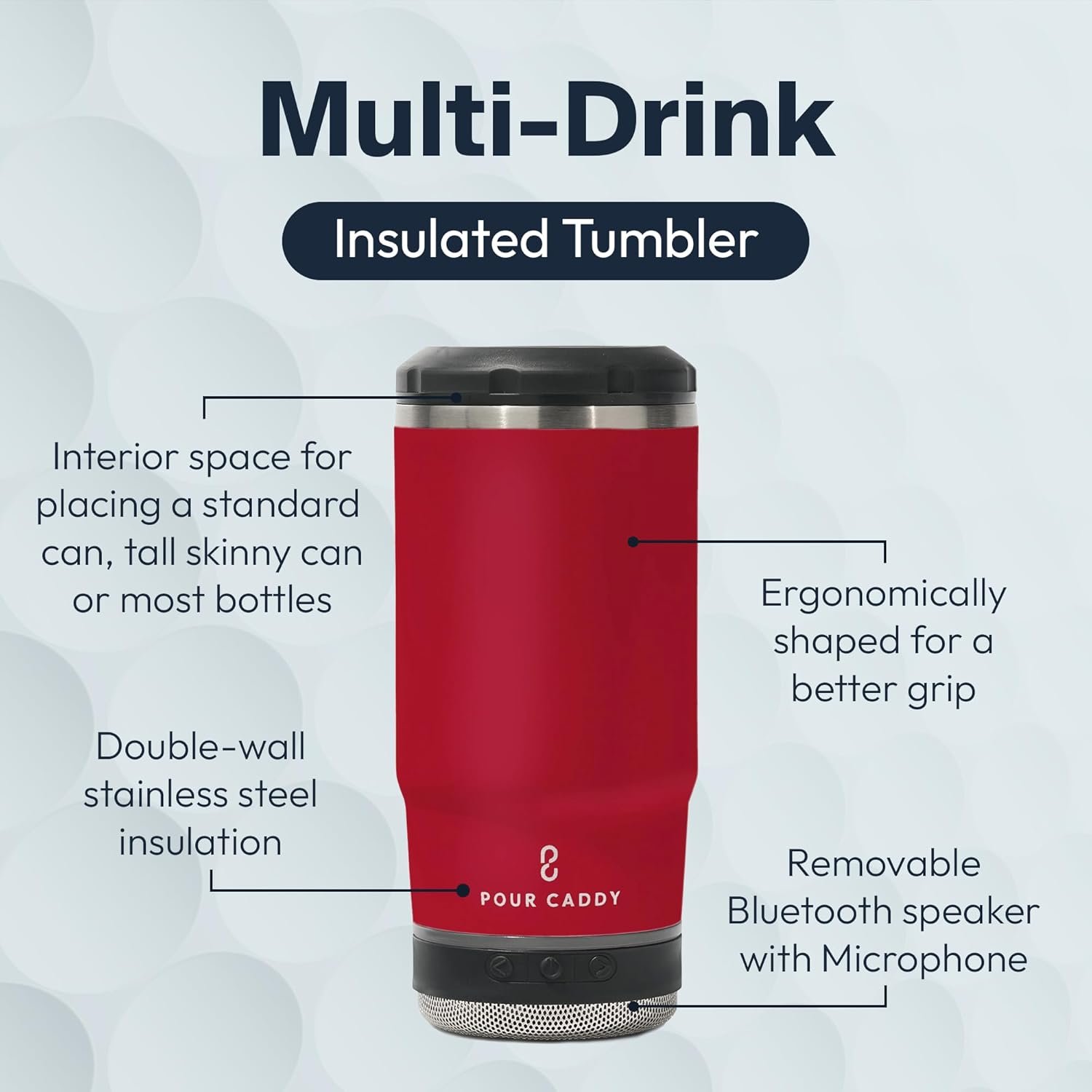 Chill and Brew Bluetooth Speaker Cup, Insulated Can and Bottle Holder for Hot or Cold Drinks, Double Wall Stainless Steel Drinkware, Fits 12 oz Cans or 14 oz Liquid, Red