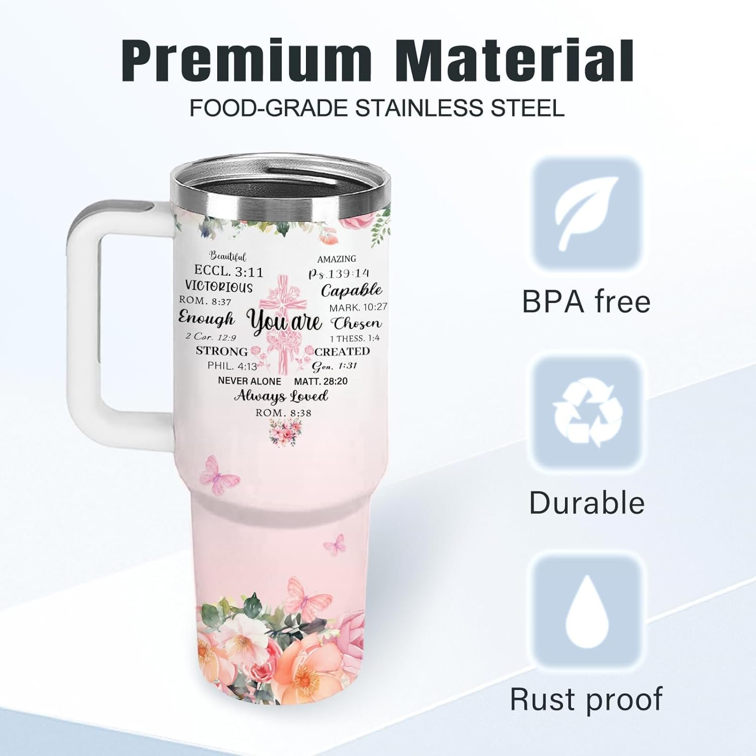 1. Christian Tumbler for Women with Uplifting Bible Verse Designed as the perfect Christian gift for women, this 40oz tumbler features a beautiful Bible verse for daily inspiration. Made from food-grade stainless steel with a leak-proof lid and included straws, it’s a safe and practical religious gift she’ll use every day.