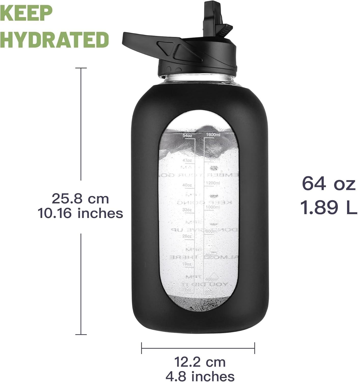 CIVAGO Half Gallon Glass Water Bottle with Straw and Insulated Bottle Holder Sling, 64 oz Motivational Water jug with Time Marker and Silicone Sleeve, Water Flask with 2 Lids, Black