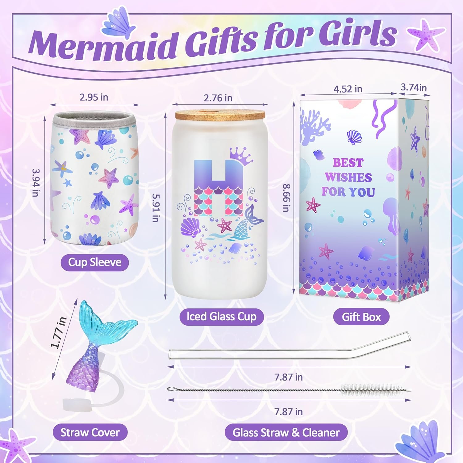All-Inclusive Mermaid Tail Gifts for Girls: This cute mermaid tail design drinking cup, in addition to a bamboo lid, glass straw and straw brush, also comes with a dust-proof straw cover cap and an insulated cup sleeve. The custom mermaid tail straw topper, made from high-grade silicone, fits snug to keep dust out and prevents splashes. The customized mermaid tail desgin making it suitable for most girls aged 4-12.
