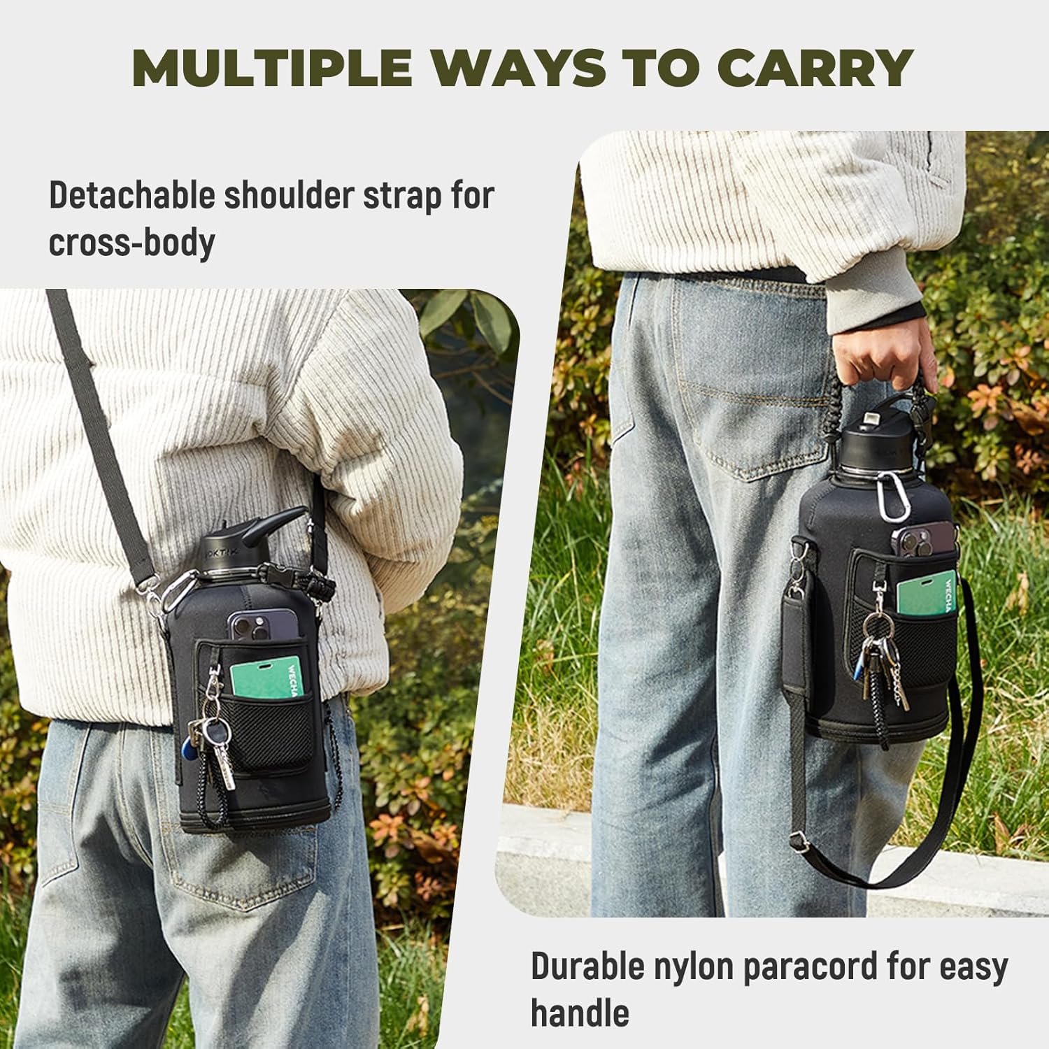 Iconic Paracord Handle & Carrying Pouch Bottle: This water bottle comes with a hand-knit nylon paracord handle in a color that matches the bottle, making it a must-have for camping, hiking, or outdoor adventures. The included carrying pouch features a removable shoulder strap for hands-free convenience and a zippered pocket to securely store your phone, cards, keys, and other essentials