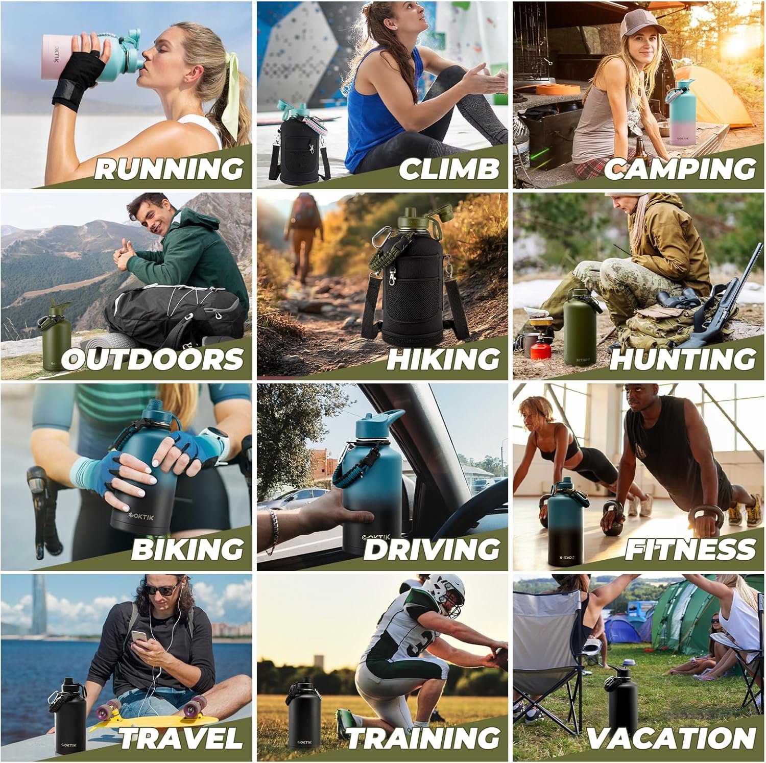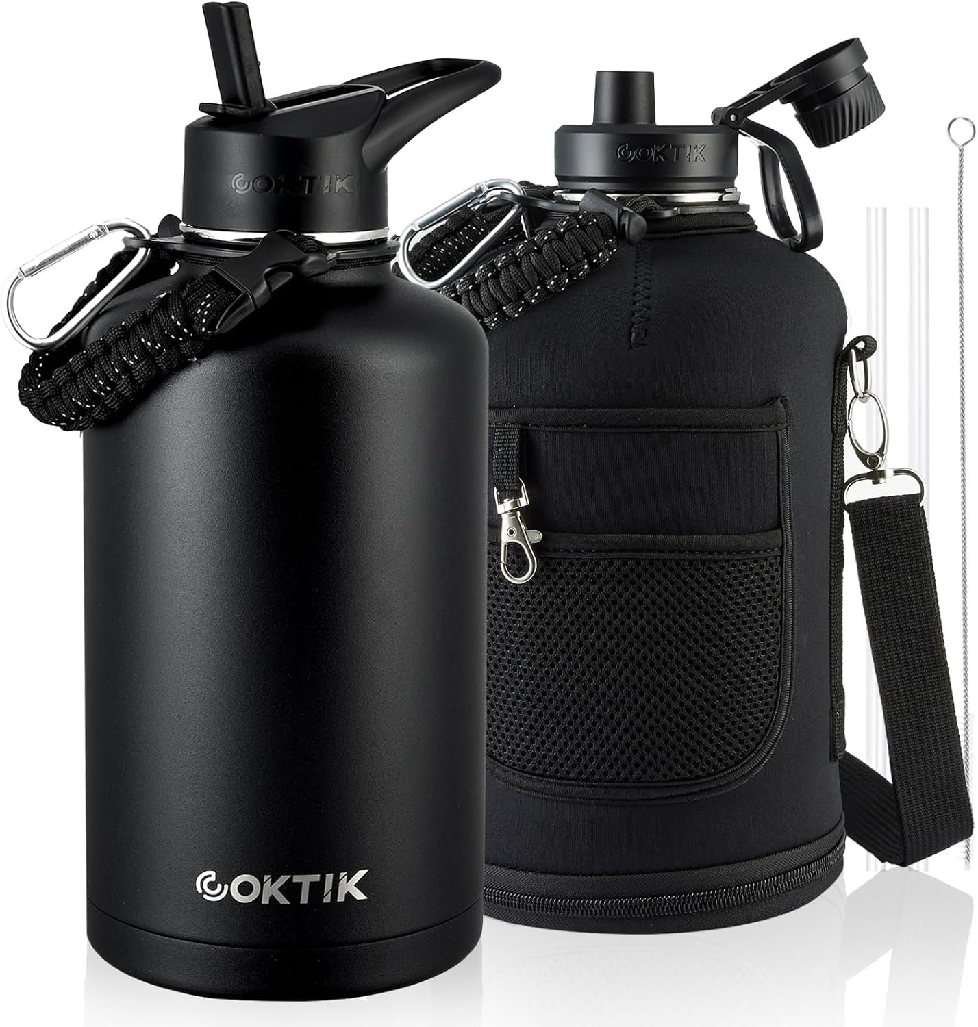 What’s Included: When you purchase this half-gallon insulated water bottle, you’ll receive 9 premium accessories: Carrying Pouch with Shoulder Strap, Straw Lid with 2 Straws & Straw Brush,Spout Lid, Paracord Handle,Bottle Brush