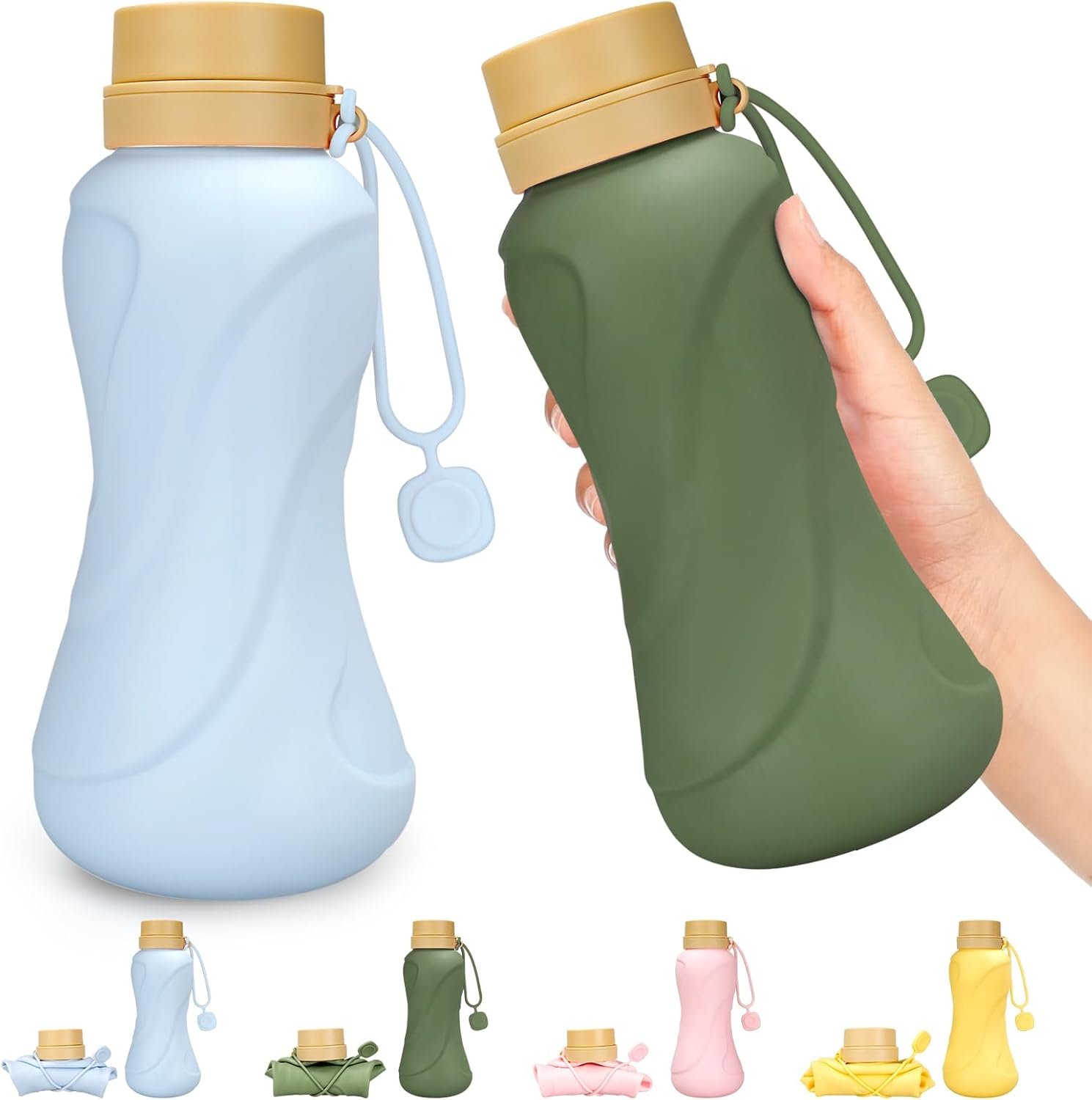 Collapsible Water Bottles, 2 pack 22oz Silicone Foldable Water Bottles Leakproof BPA Free ,650ml Travel Water Bottles for Sport Gym Travel School Camping Hiking Running (Light Blue & Army Green)