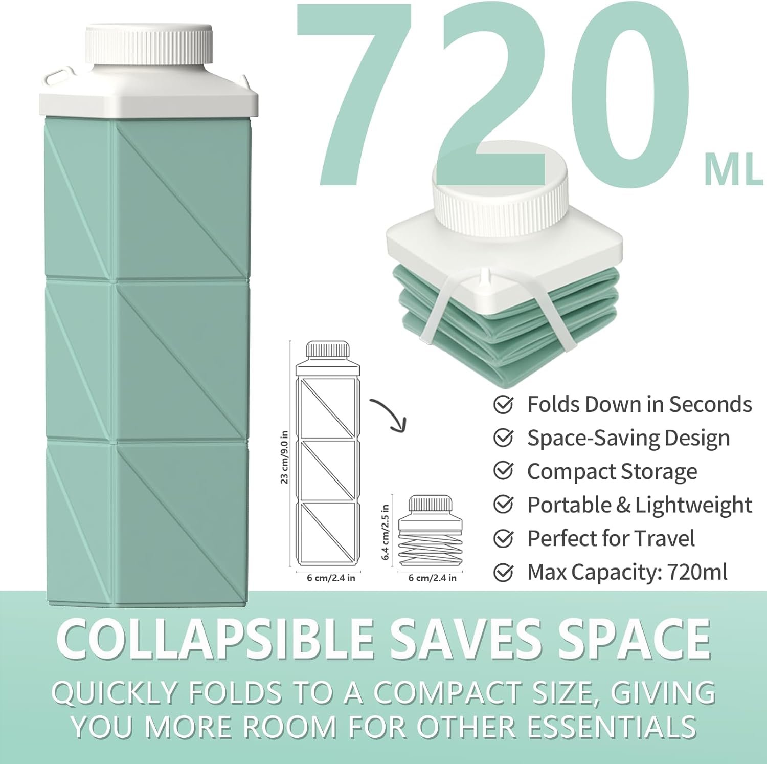COLLAPSIBLE AND SPACE-SAVING DESIGN: With a generous 24.3oz (720ml) capacity, this water bottle effortlessly folds down to a compact size, saving valuable space in your bag or backpack—perfect for your on-the-go lifestyle.