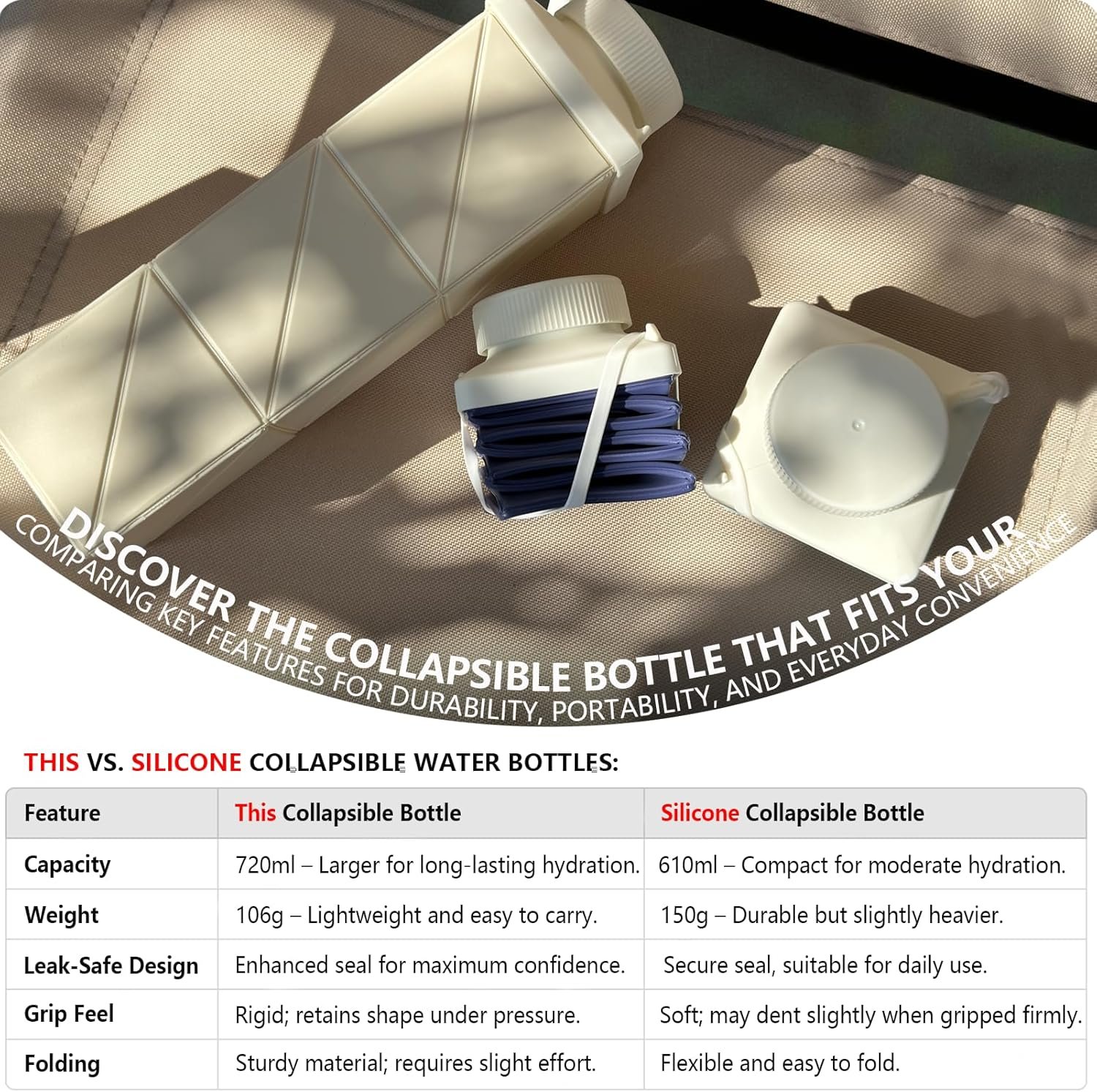 Weighing just 3.7oz (106g), this ultra-light collapsible water bottle is designed for effortless carrying. Whether you’re traveling, hiking, or simply going about your daily routine, it provides convenient hydration without weighing you down. Stay refreshed without the bulk!