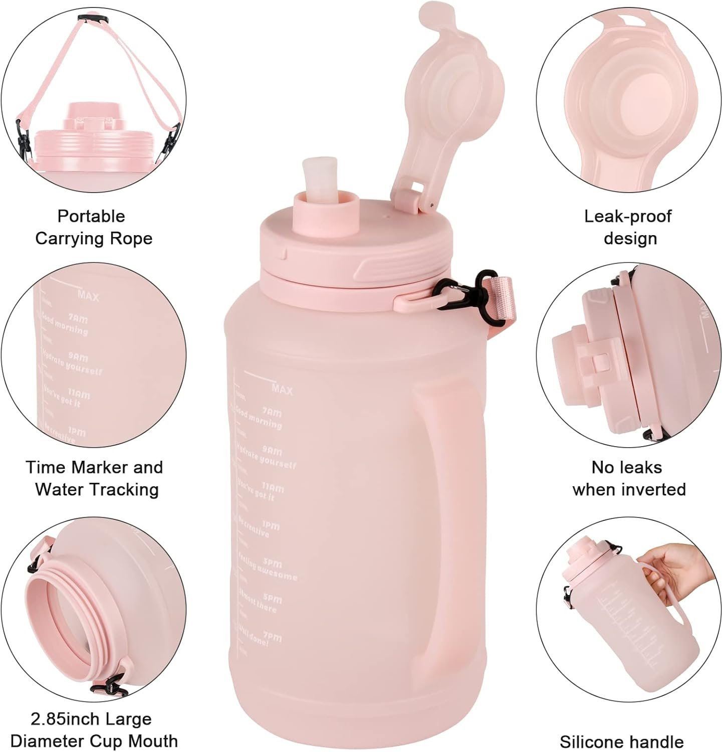 Large Capacity: 2L/64OZ water bottle with built-in silicone gasket and snap spout design to prevent leaks and spills.