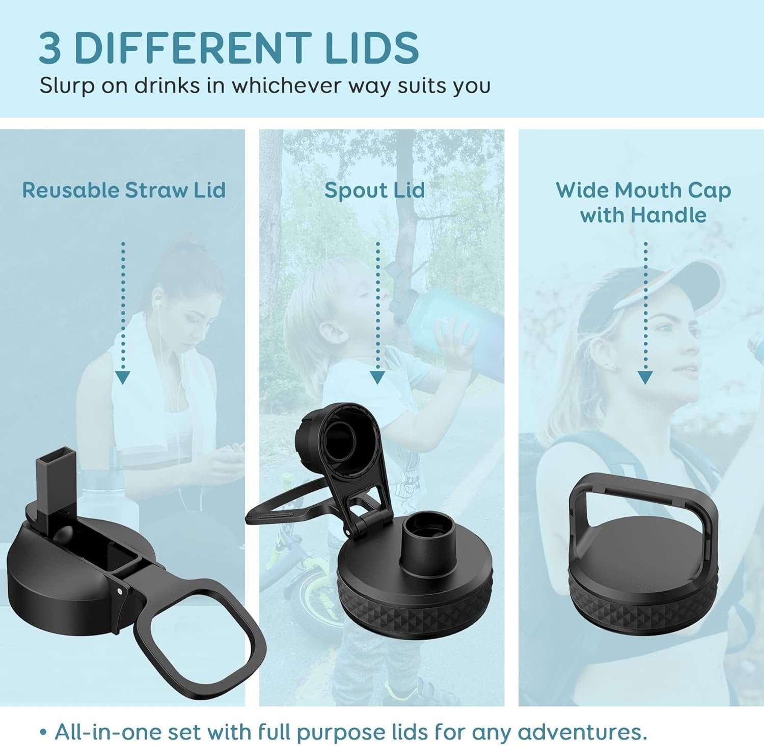 Flexible Drinking On-the-Go: This water jug comes with 3 different lids. The screw-on lid with flip-up handle is for easy ice refilling with superior portability; spout lid makes it convenient to drink hot liquid and straw lid for sipping cold