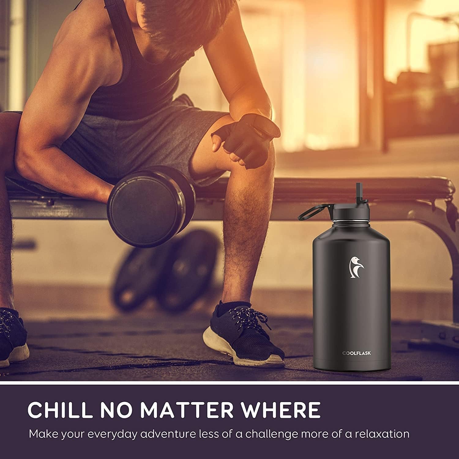 Coolflask Gallon Water Bottle Insulated with Straw&3 Lids, 128 oz Water Jug Large Stainless Steel Metal Vacuum Wide Mouth for Sports, Gym or Office, Non-BPA Keep Cold 48H Hot 24H, Magic Black