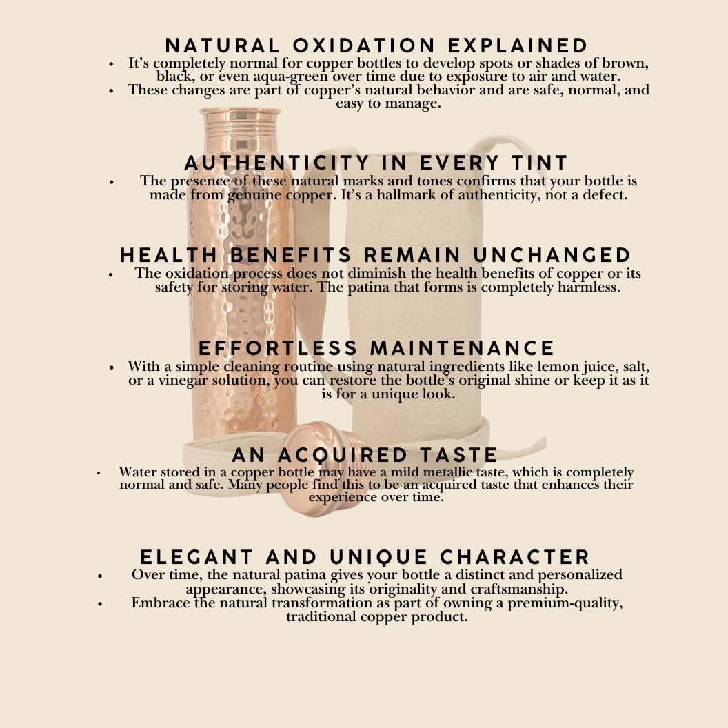 Naturally Beautiful Patina Over Time – Proof of Authenticity As with all Ayurvedic copper bottles, a rich natural patina may develop with use—this is a hallmark of genuine copper and adds vintage charm. The antique finish evolves beautifully, reflecting the authenticity of your pure copper bottle for drinking water.