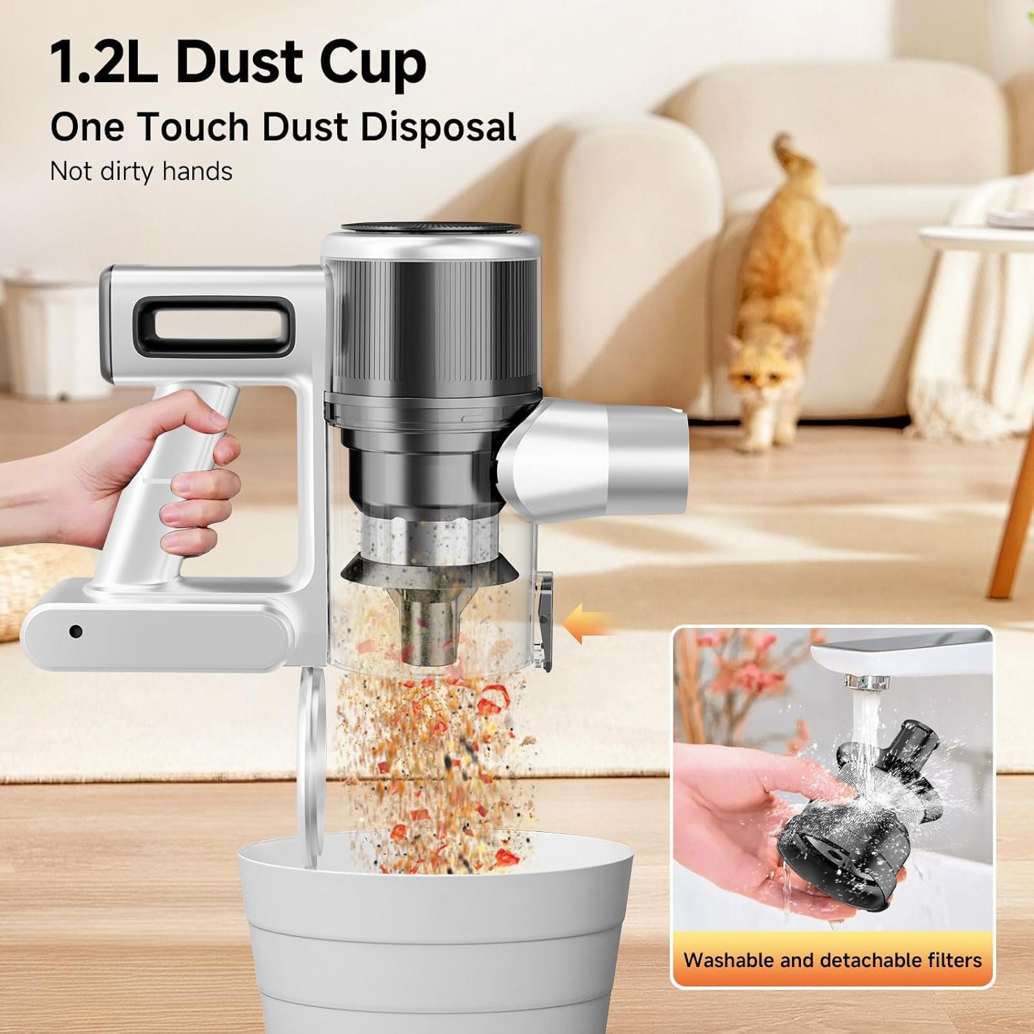 🍃【Adv-Filtration System】Stick vacuum cordless rechargeable features a fully sealed cyclone filtration system with a HEPA filter, stainless steel filter, and sponge filters, capturing up to 99.99% of fine dust particles as small as 0.1 microns. It effectively prevents secondary pollution and ensures clean, fresh air.