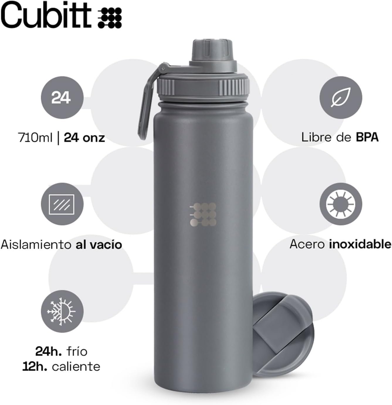 Cubitt Insulated Sports Hydro Water Bottle 24 oz, 2 Lids (Coffee Lid and Wide Mouth Twist Sports Lid), Stainless Steel, Double Walled. Cold for up to 24 hours, Hot for up to 12 hours. GREY