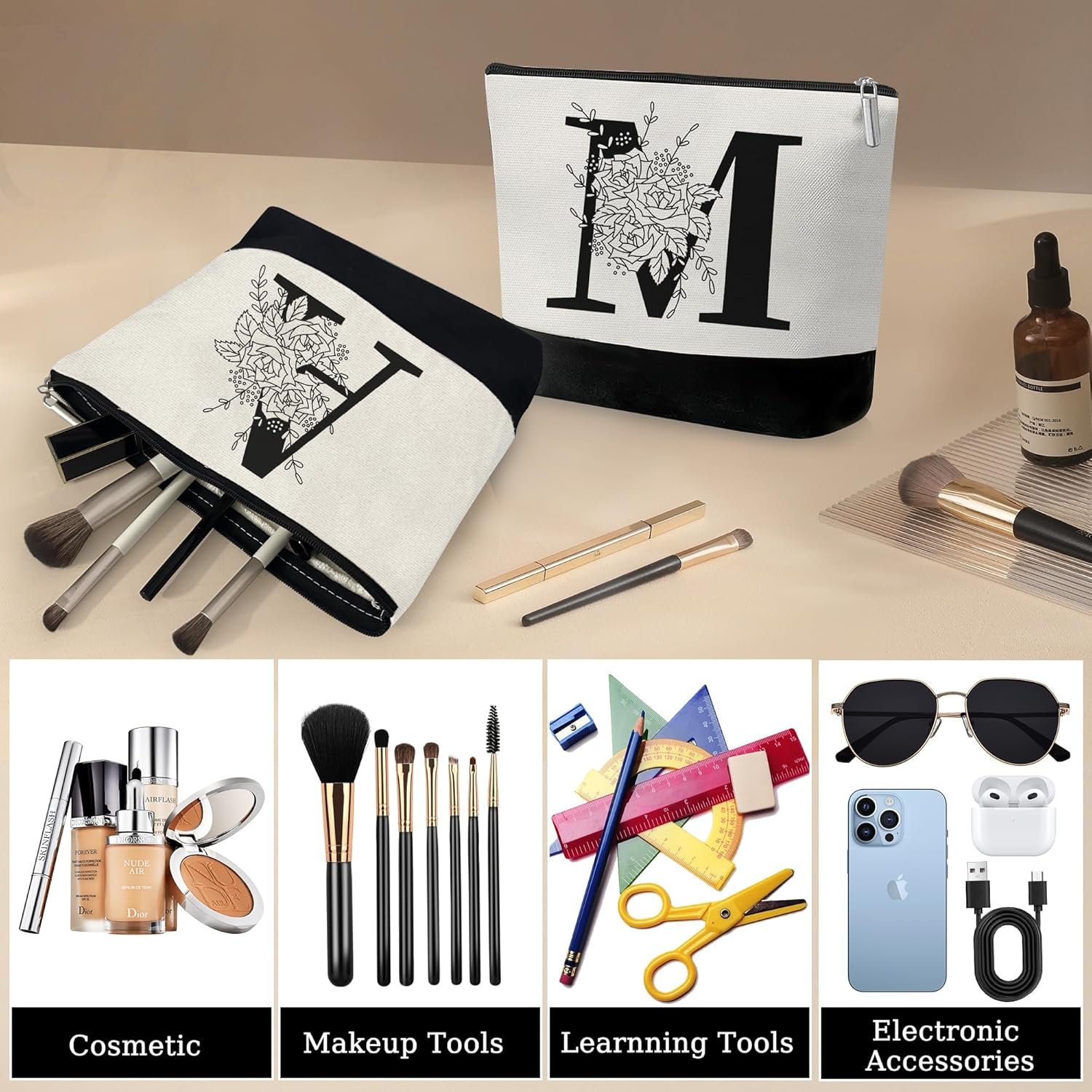 Personalized Design: Both the glass cup and the makeup bag sport attractive initial letter designs, showcasing a refined and artistic personalized style that makes them unique and special gifts.