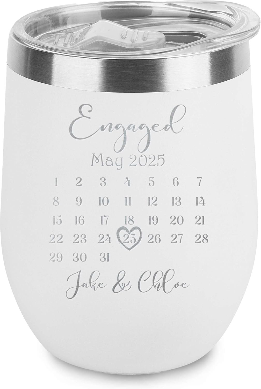 Custom Wedding Engaged Calendar Save the Date Keepsake Engraved Insulated Stainless Steel Wine Tumbler with Lid 12 oz. Personalized Engagement Announcement Gift for Bride Groom (White)