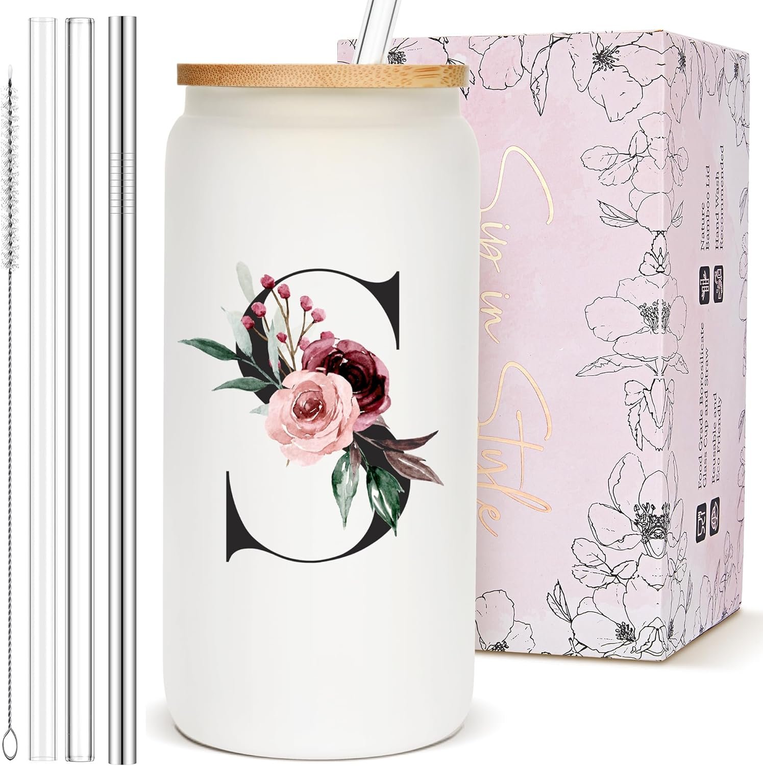 Customized Personalized Gifts for Women, Cute Initial Glass Cups with Lids and Straws, Letter Iced Coffee Cup, Monogram Drinking Glasses Tumbler Mug, Mothers Day Gifts for Mom Wife Nana Aunt Niece, S