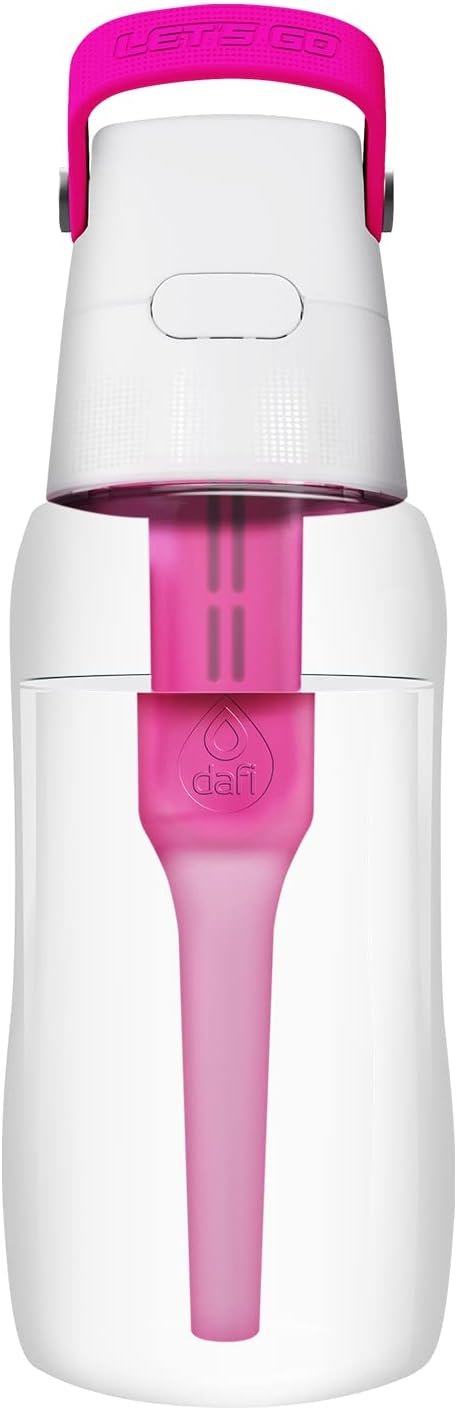 Dafi Filtered Water Bottle with Straw 17 oz -BPA-Free Waterbottle Reusable with Carbon Filter – Leakproof Purifier Flask hypoallergenic mouthpiece, carrying handle – Removes Chlorine Taste – Pink