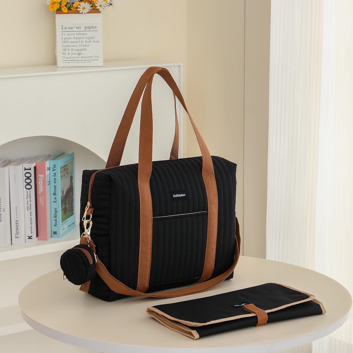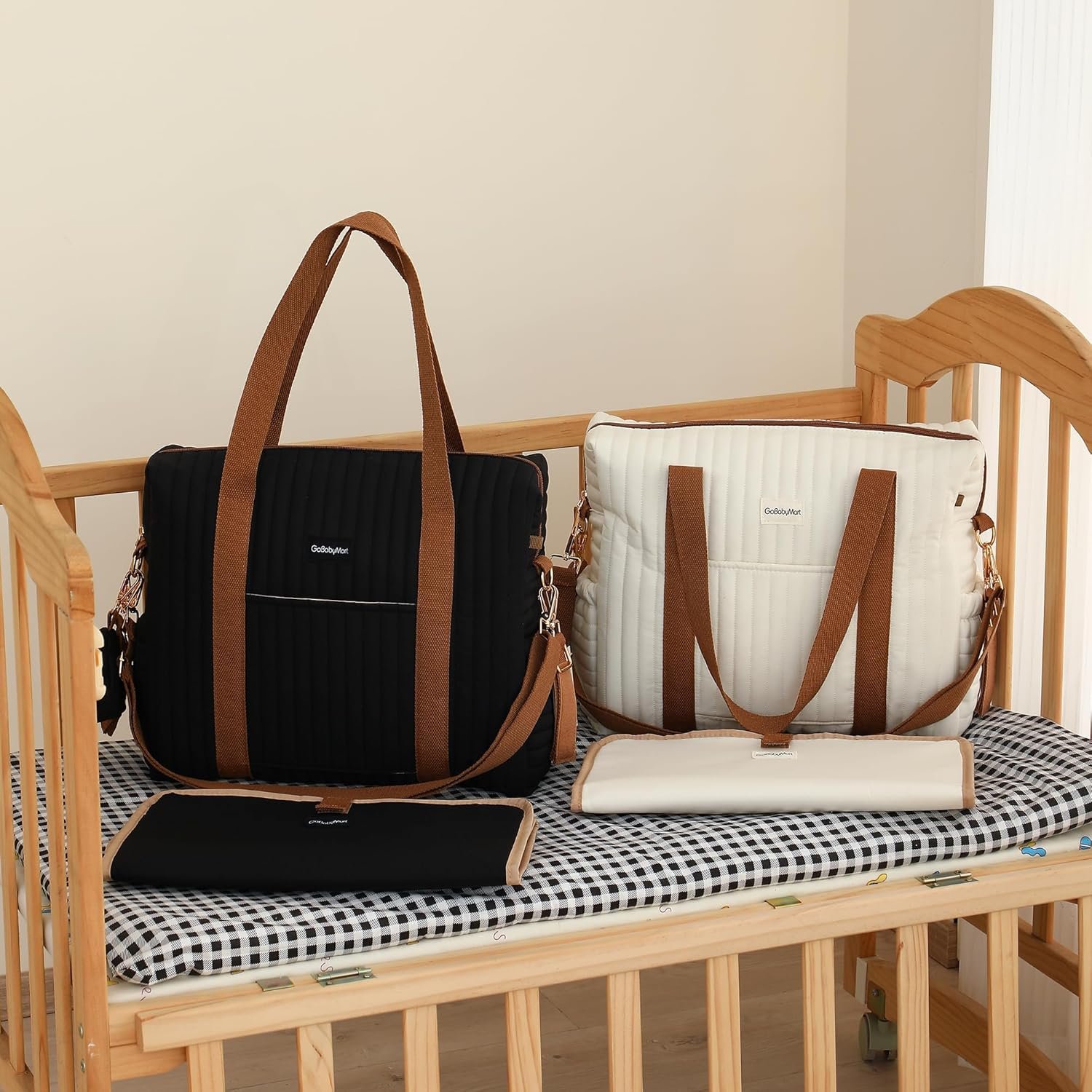 The GoBabyMart Diaper Bag Tote is a spacious, everyday diaper bag designed for moms who want easy organization, comfortable carry, and a clean quilted tote style that works beyond baby outings. This baby diaper bag features insulated bottle pockets to help maintain temperature, a quick-access front pocket for phone and keys, a detachable pacifier case, and an included waterproof changing pad for convenient on-the-go diaper changes. Soft, reinforced shoulder straps provide all-day comfort, while removable stroller straps allow secure attachment for walks, errands, and travel. Large enough to carry daily baby essentials without feeling bulky, this diaper bag tote transitions effortlessly from everyday use to travel and hospital packing, making it a reliable diaper bag for every stage of parenthood.