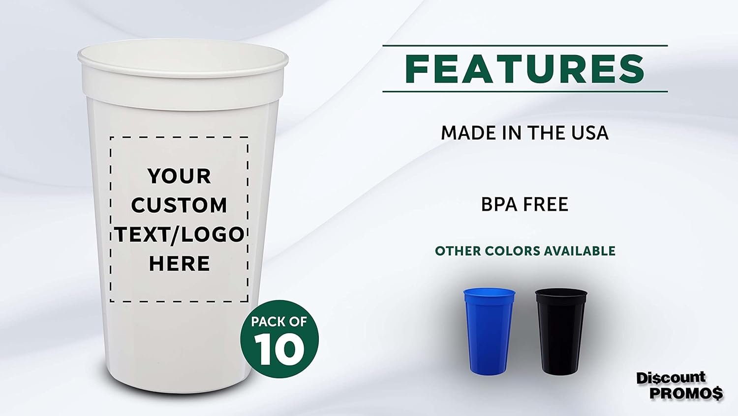 DISCOUNT PROMOS Custom Plastic Stadium Cups 22 oz. Set of 10, Personalized Bulk Pack – Perfect for Birthdays, Picnic, Beach, Parties – Translucent White