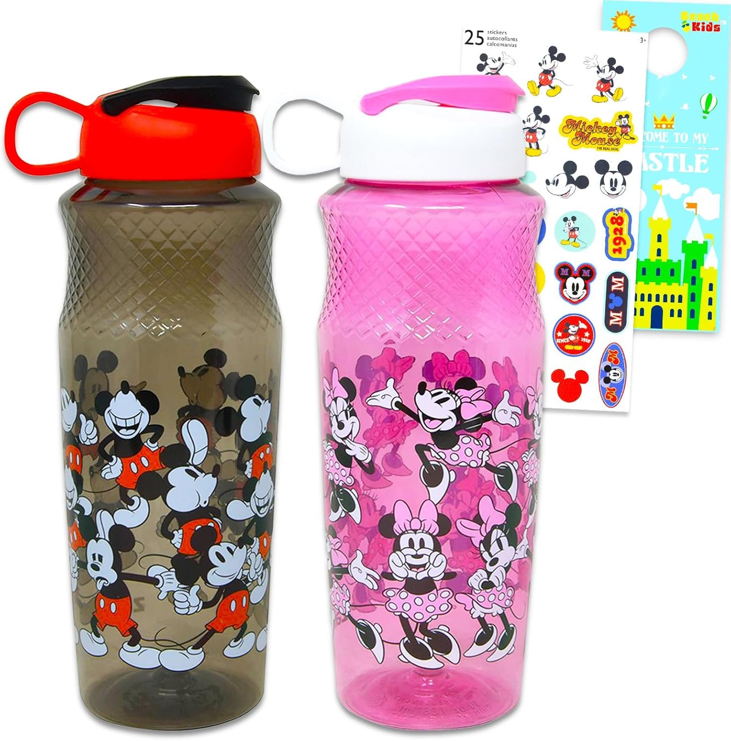 Disney Mickey & Minnie Mouse Water Bottle Set – 2 Pc Disney School Supplies Bundle of Drinking Bottles Plus Stickers and More | Sports Cups for Kids. This Disney Mickey and Minnie water bottle set includes two 30 oz water bottles with colorful images of Mickey Mouse and Minnie Mouse and pop-top lid. Take your Mickey Mouse and Minnie Mouse water bottles with you wherever you go! This Mickey and Minnie water bottle bundle is perfect to take to school, the beach, a picnic, or anywhere else! Stay hydrated all day no matter where you are. Made of durable plastic, these Mickey and Minnie water bottles are sure to last and the convenient top with lid will ensure your drink won’t spill! Officially licensed Disney water bottles for kids also comes with Mickey Mouse stickers, and a Beach Kids castle door hanger.