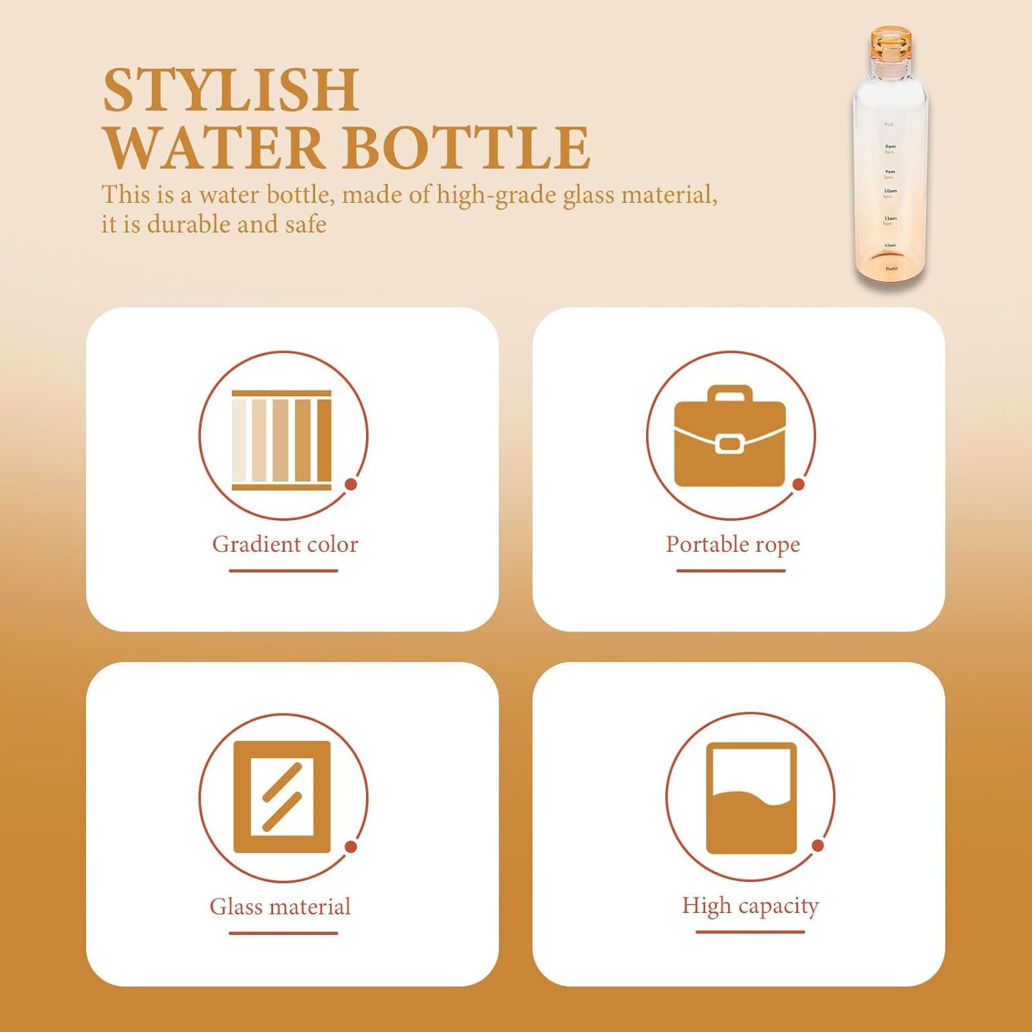 Core Material Safety: Crafted from premium borosilicate glass, this borosilicate water bottle offers a transparent and safe way to stay hydrated while supporting environmental protection through its reusable design
