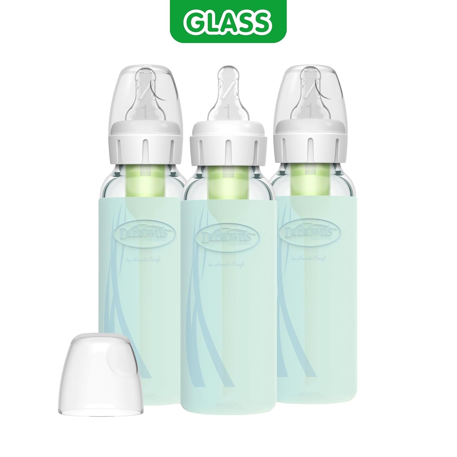 Dr. Brown’s Natural Flow Anti-Colic Options+ Narrow Glass Baby Bottles 8 oz/250 mL, with Level 1 Slow Flow Nipple, 3 Pack 0m+ with Mint 100% Silicone Sleeves, BPA-Free