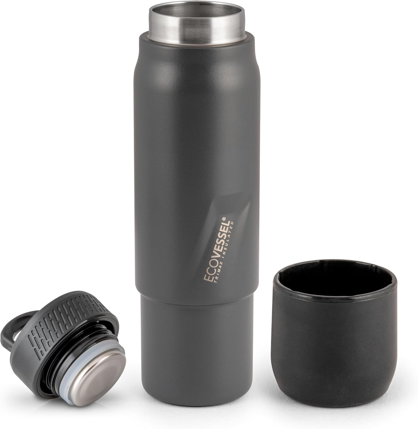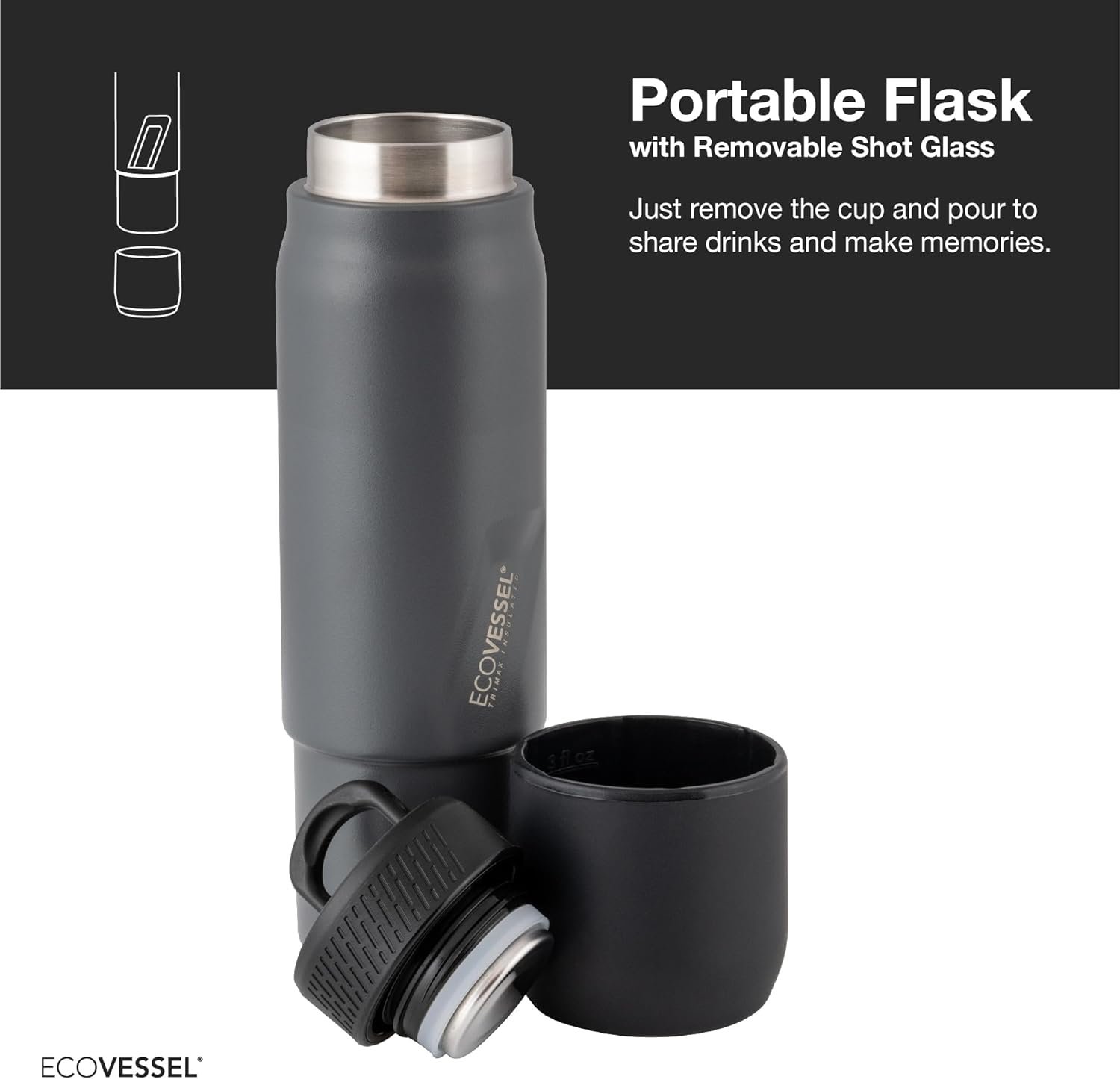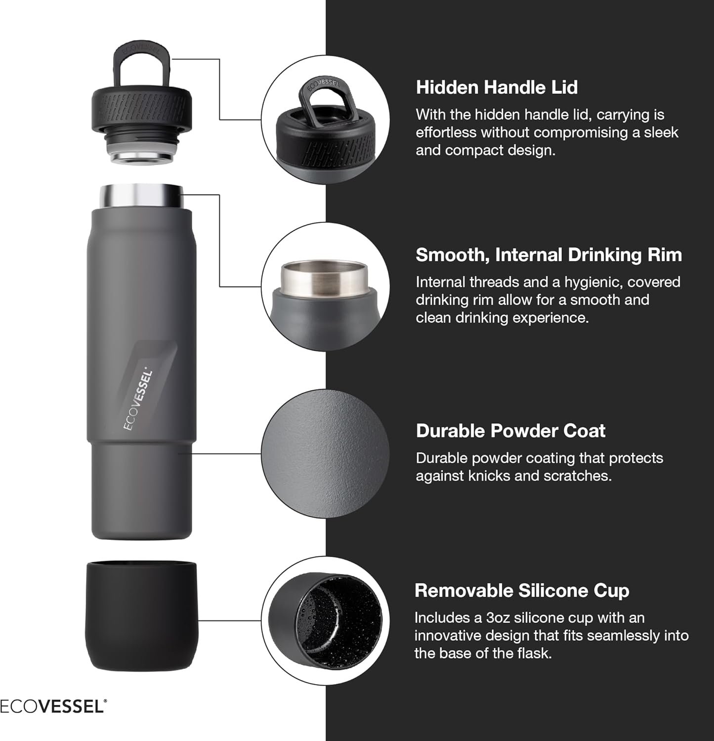 EcoVessel Stainless Steel Flask with Removable Shot Cup, Vacuum Insulated Bottle for Hot and Cold Drinks, Thermos with Folding Handle for Travel and Camping, 8oz (Gray)