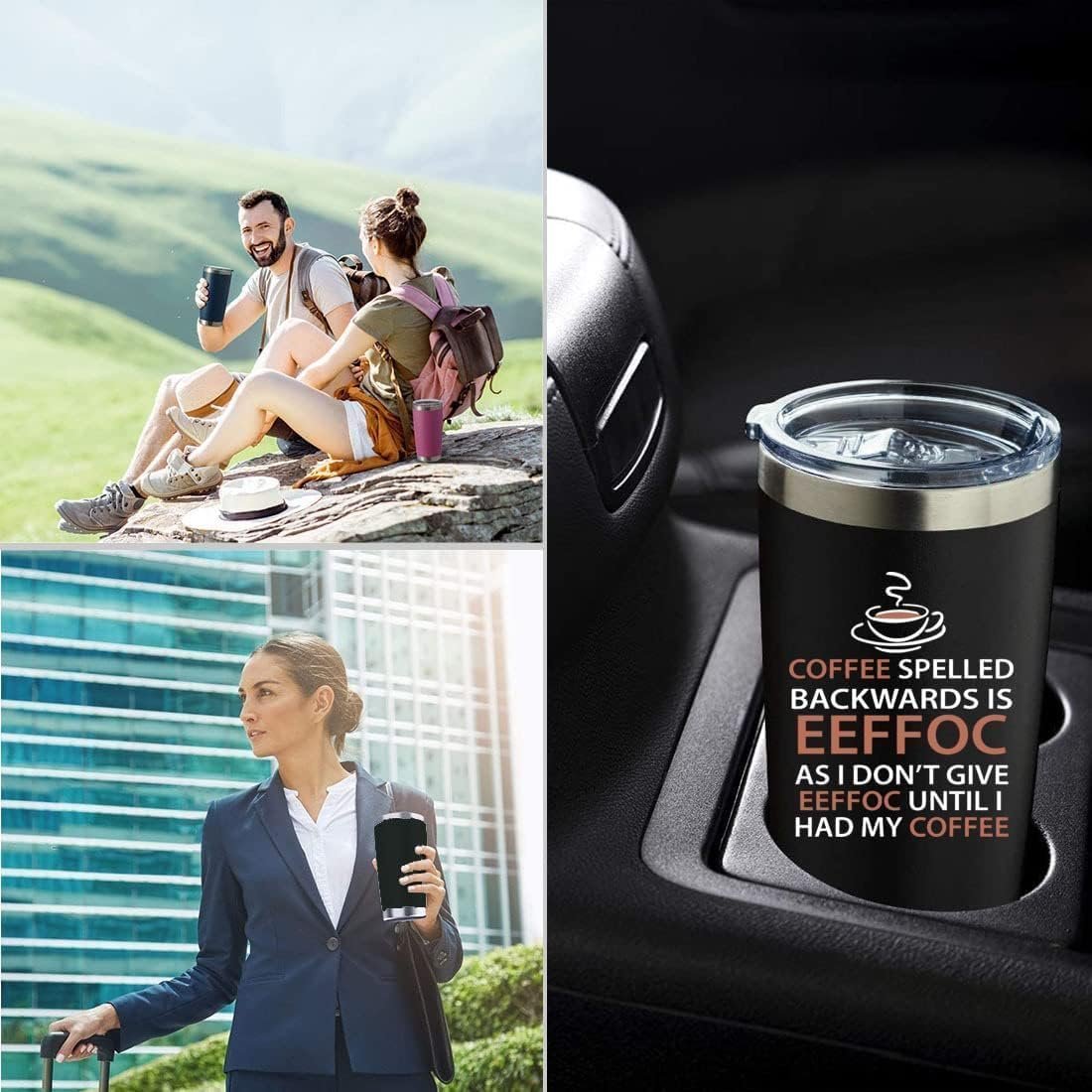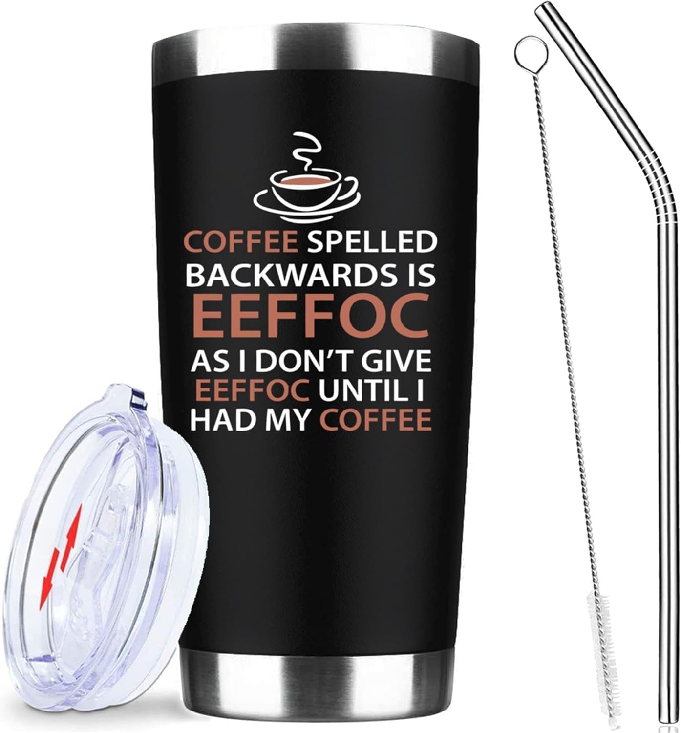 Eeffoc Is Coffee Spelled Backwards Funny Coffee Tumbler,20oz Insulated Stainless Steel Travel Mug with Lid,Straw and Brush,Double Wall Iced Travel Cup,Gifts for Women,Men,Boss,Friends,Employ(Black)