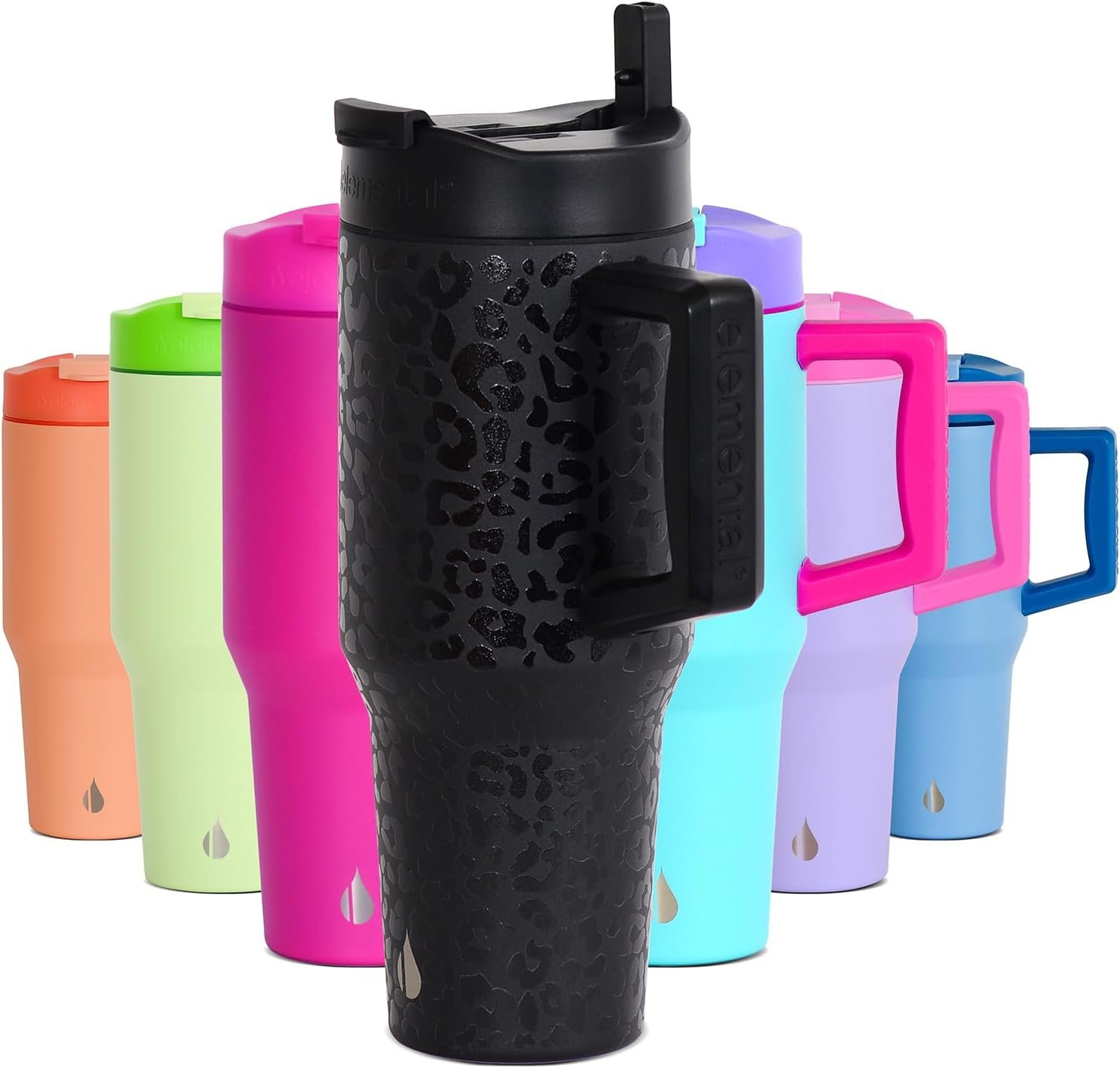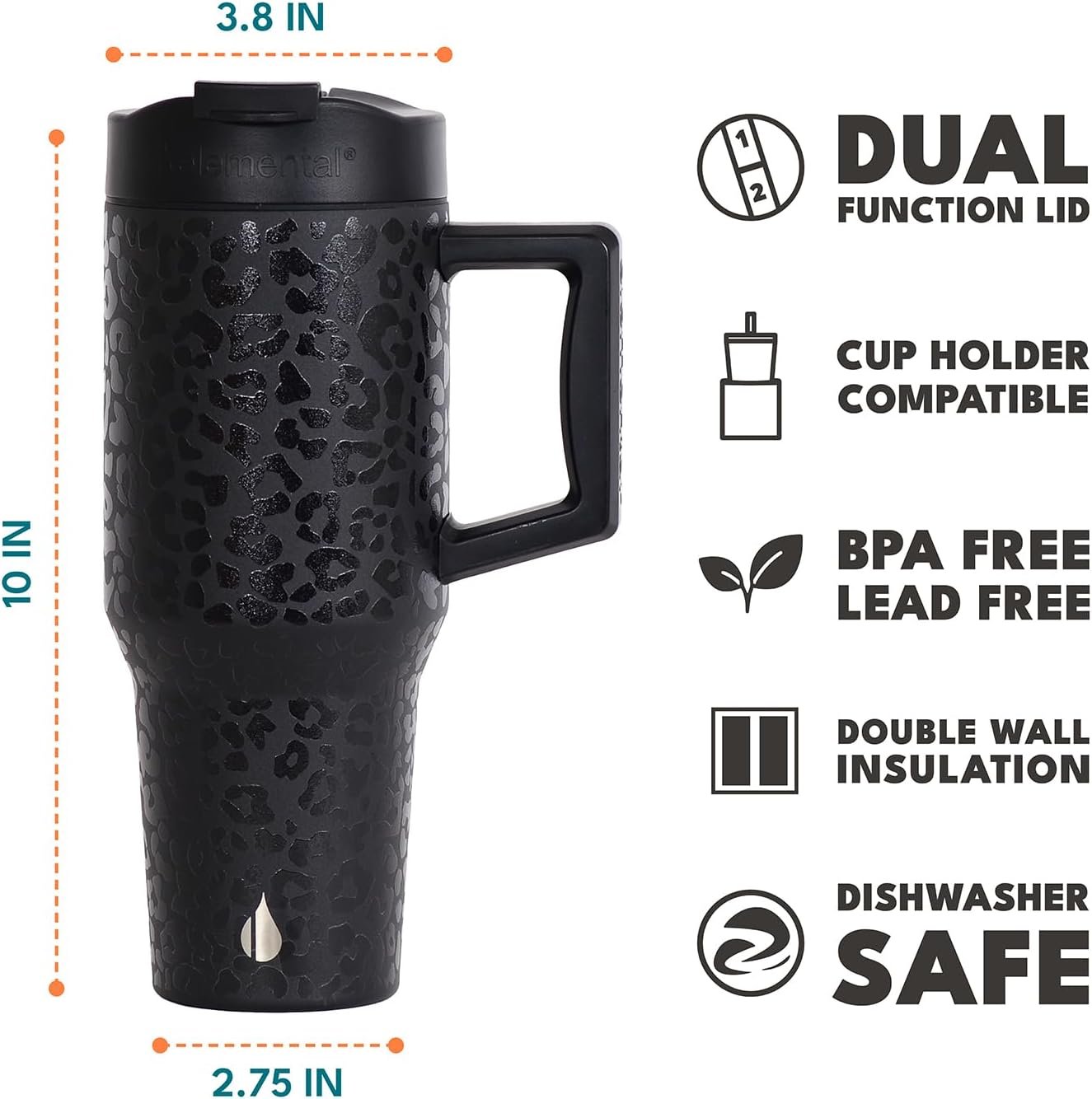 Elemental 32 oz 100% Leak Proof Tumbler with Handle & Straw – Stainless Steel Double Wall Insulated Tumbler for Hot and Cold Beverages – Travel Coffee Mug with Sip & Straw Lid – Black Leopard