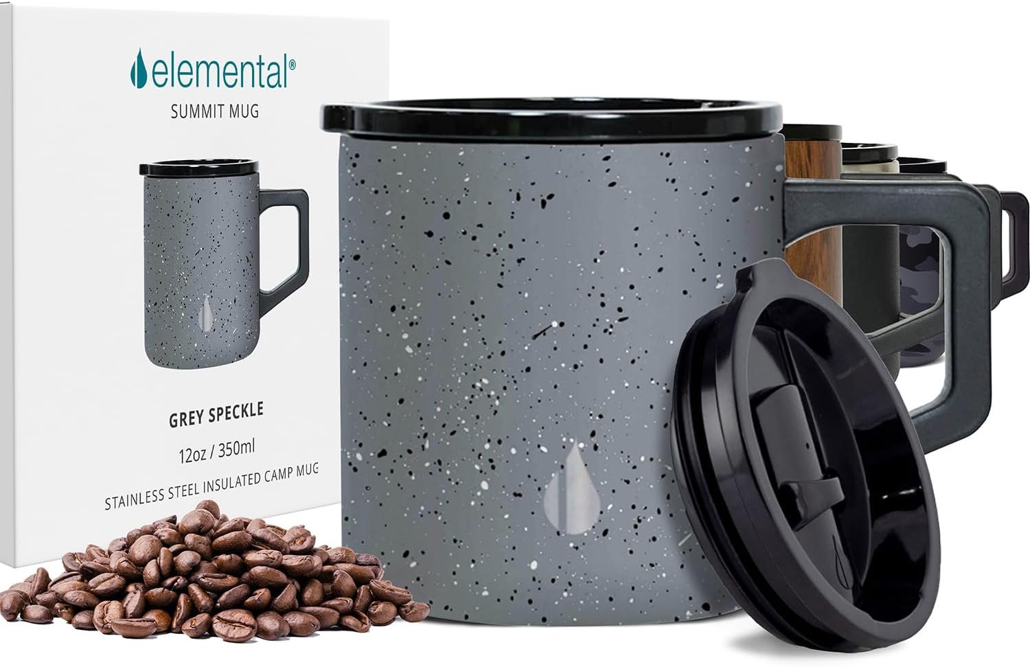 Elemental Insulated Coffee Mug – Triple-Wall Stainless Steel Summit Travel Cup for Hot and Cold Drinks – Thermal Coffee Mug with Lid and Handle for Camping, Office & Travel 12oz – Grey Speckle