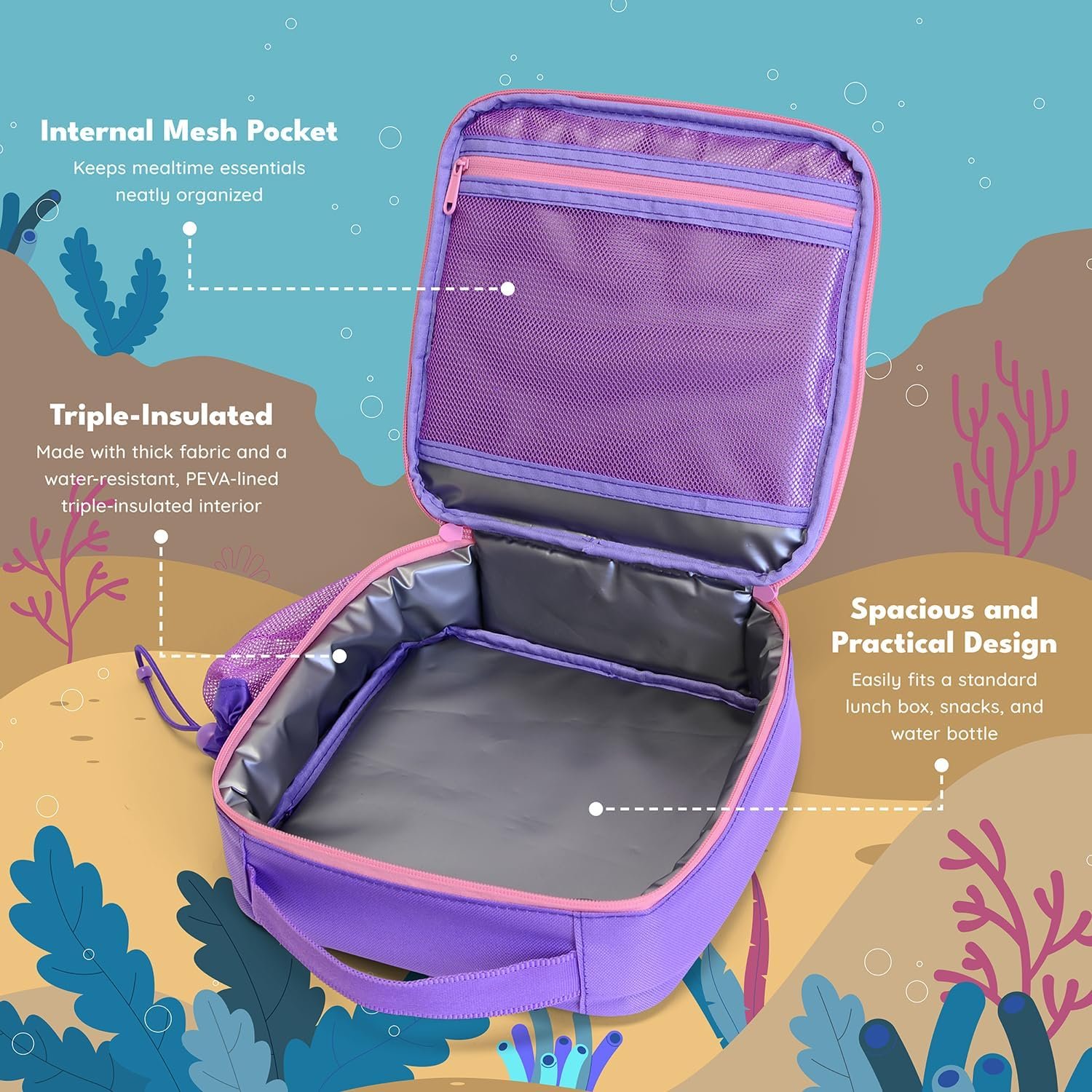 Elemental Insulated Lunch Bag for Kids, with Water Bottle Pocket & Charm Band, Fits Lunch Box, Lunch Bag for School to Keeps Food at Optimal Temperature, 3L – Mermaid