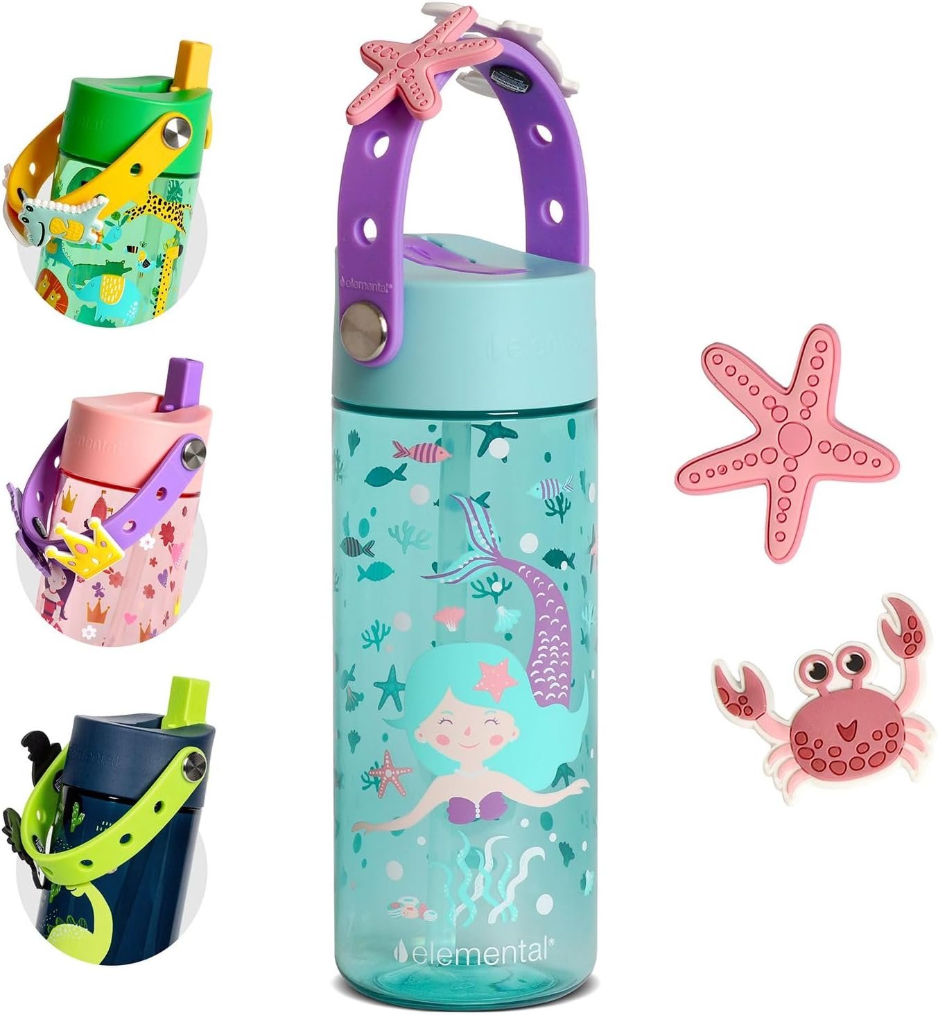 Elemental Water Bottles for Kids – Splash Kids Water Bottle for School with Fun Charm Handle – BPA Free Tritan Plastic Bottle with Straw Leak Proof When Spout is Closed – 18oz – Mermaid