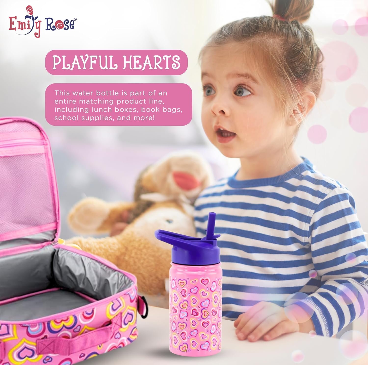 Emily Rose Kids Insulated 12 Oz Stainless Steel Bottle for Travel and School – for Girls Kids – Leak Proof with 2 Straws (Playful Hearts Design) | USA Business