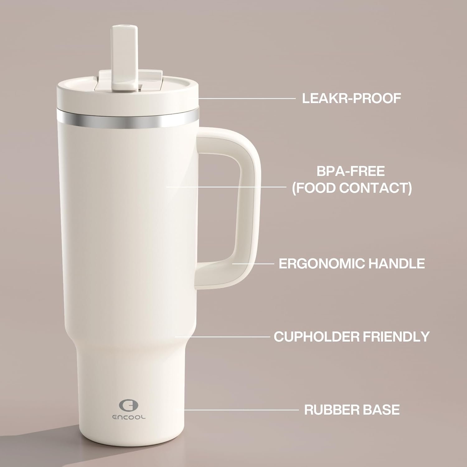 ENCOOL 40 oz Tumbler with Handle and Straw: Stainless Steel Insulated Tumbler Keeps Cold for 24 Hours, Leakproof Travel Cup Fits in Cup Holder and BPA-Free, Cream Moon