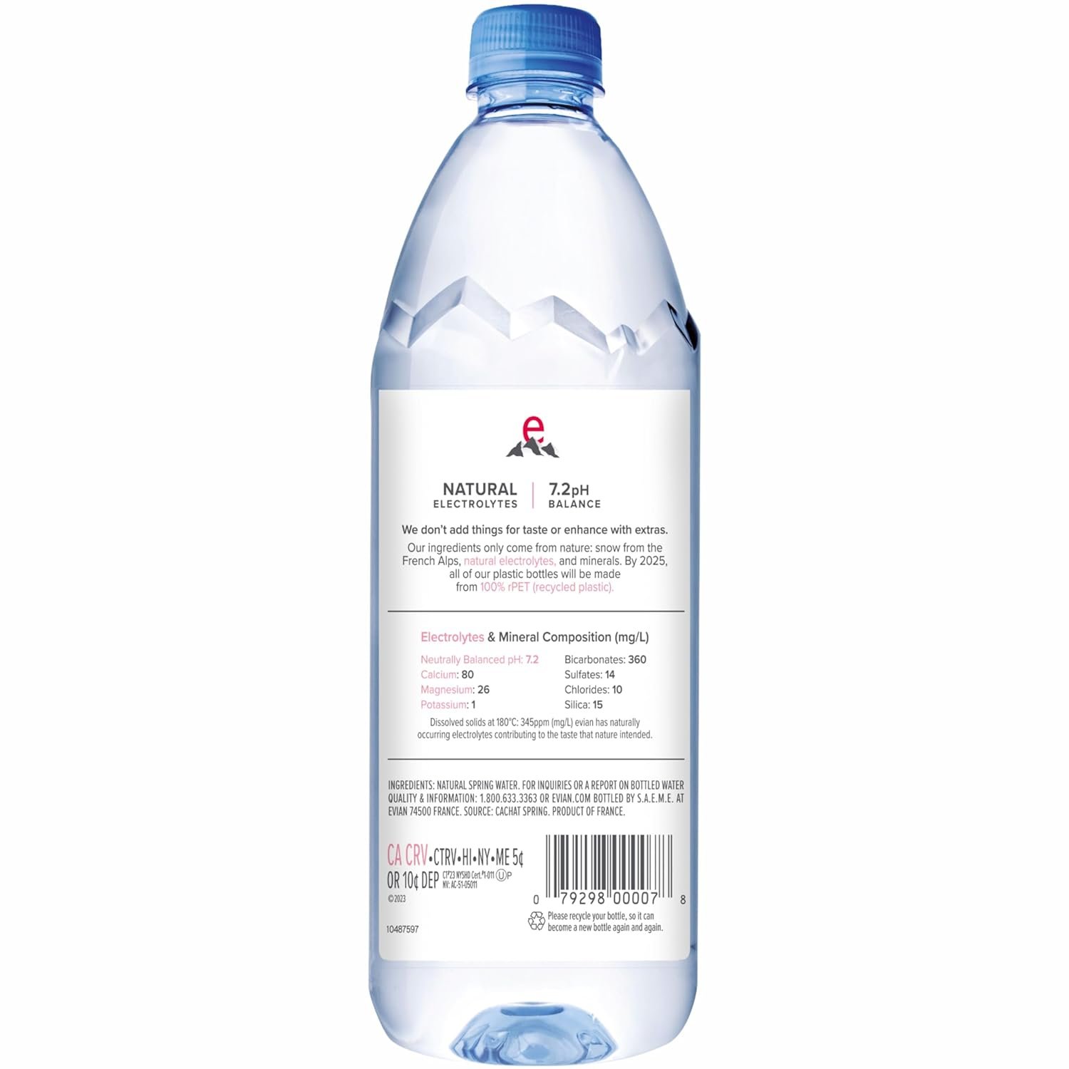 Evian Natural spring water from the French Alps. evian water starts as snow and rain on the peaks of the pristine French Alps. Protected deep in the heart of the mountains, each drop filters through layers of mineral-rich glacial sands for over 15 years. evian natural spring water begins as snowflakes and mountain rain, naturally filtered through glacial rocks for over 15 years, giving evian its purity, mineral content and neutrally balanced 7.2 pH for delicious natural spring water. Pure as nature intended, the water springs from the source in Evian-Les-Bains where it’s been bottled since 1826. Our pure bottled natural spring mineral water is always a refreshing, naturally hydrating drink. Its quality and taste make it perfect for serving by the glass, or drinking directly from the bottle at home, at school or at the gym. evian is committed to the environment & respecting the water cycle. Our recyclable plastic bottles contain up to 35% recycled plastic. They’re perfect for your backpack or gym bag or keep them in your fridge for cool refreshment anytime. Our natural spring WATER has a balanced mineral composition and naturally occurring electrolytes that give it a distinctive, smooth taste, unique among bottled waters. It’s the perfect rehydrating beverage, delicious either cold or at room temperature.
