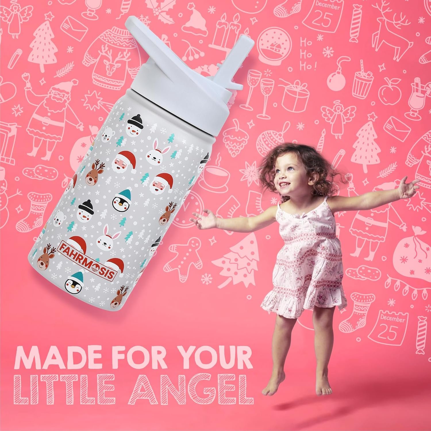 FAHRMOSIS 14 OZ Kids Water Bottle with Straw & 2 Lids (Flip & Spout) Leak Proof Metal Insulated Stainless Steel Reusable Tumbler for School & Sports Water Bottle – White (Winter)