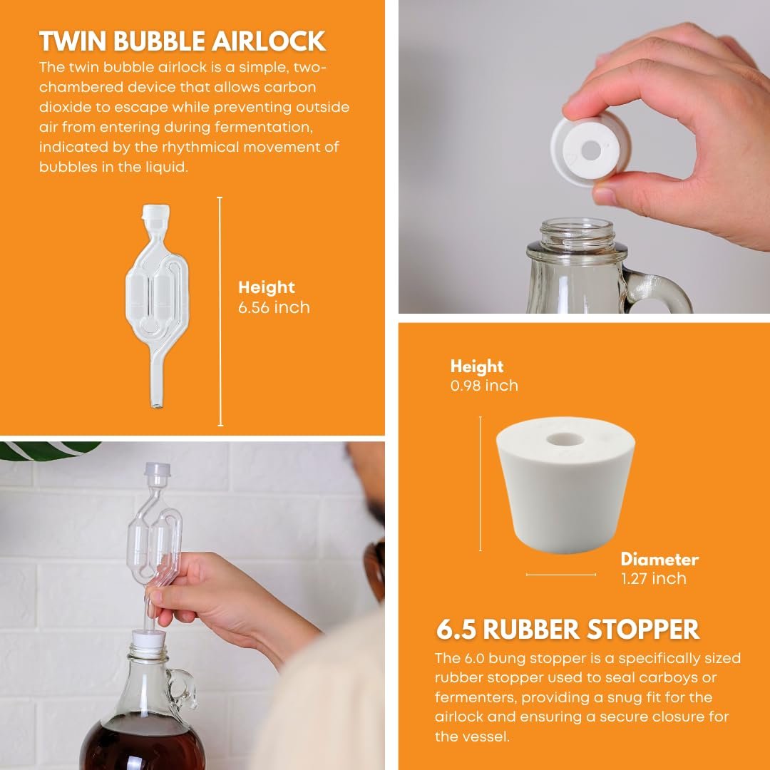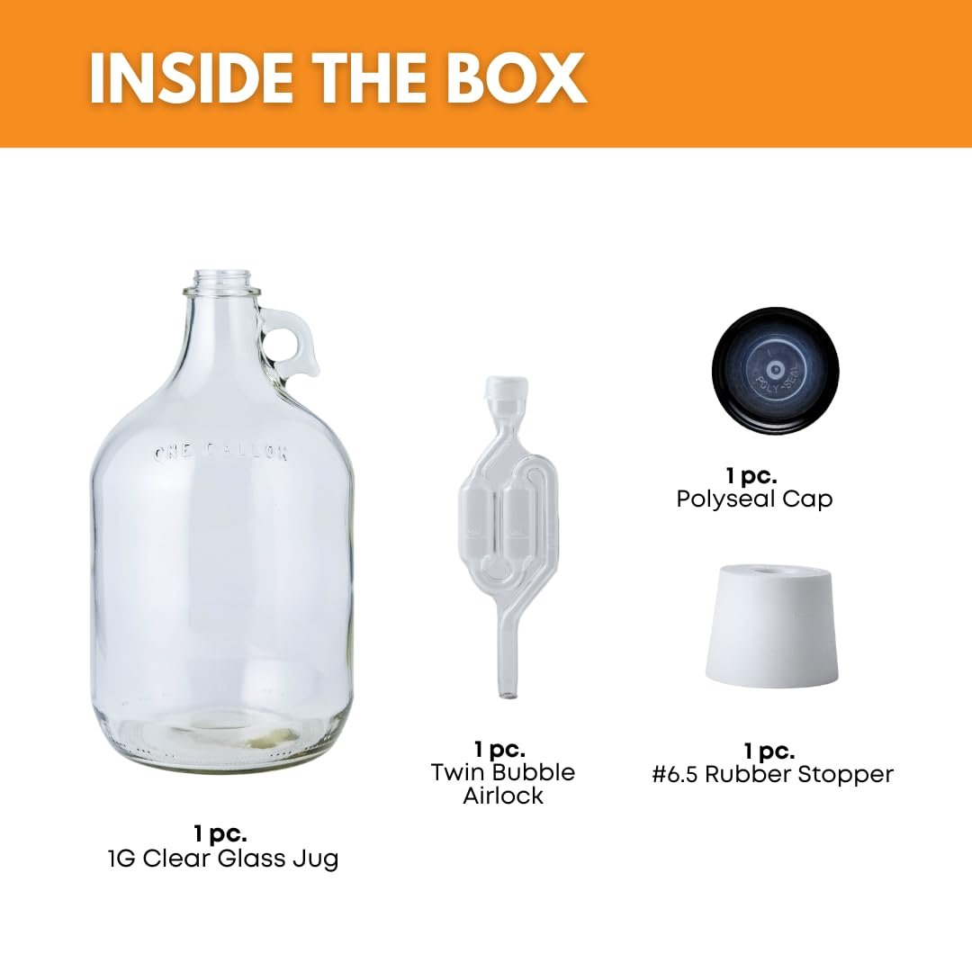 [WHAT’S INCLUDED] With this purchase, you’ll receive a clear 1 gallon glass jug (128 oz, 3.8 liter), #6.5 drilled rubber bung and twin bubble airlock with black polysealed lid; a great addition to your wine making supplies and equipment.