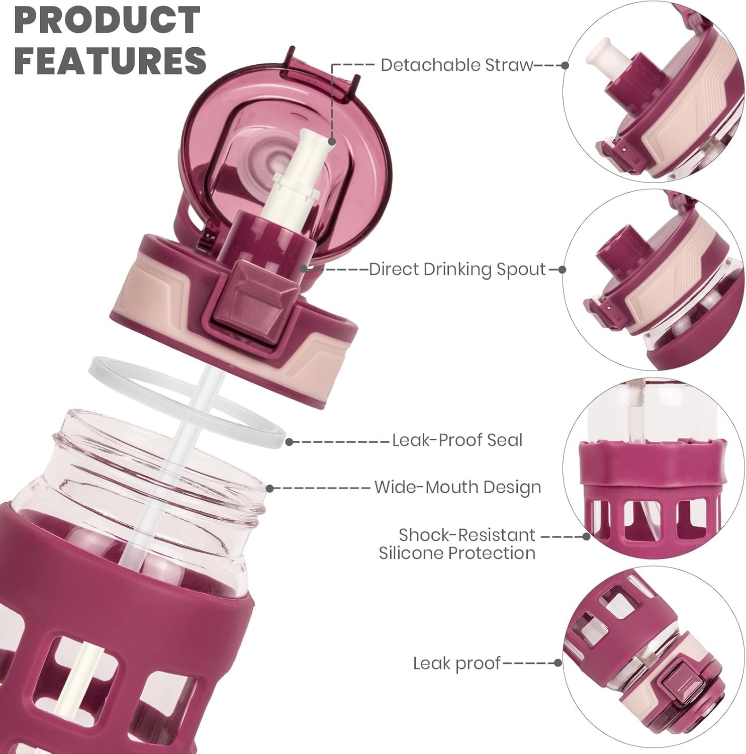 Product Summary: Ferexer 32oz/22oz Glass Water Bottle with Straw Handle Flip lids, leakproof, BPA free, Borosilicate Glass Bottles, with Protective Non-Slip Silicone Sleeve Sports Glass Drinking Bottles Red